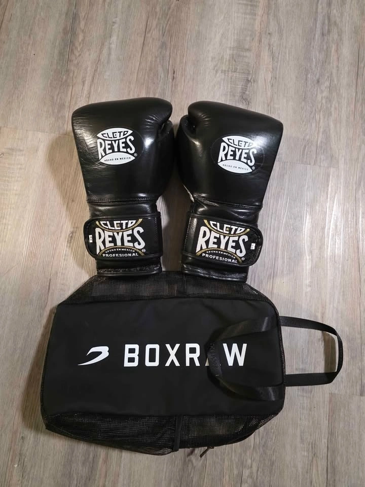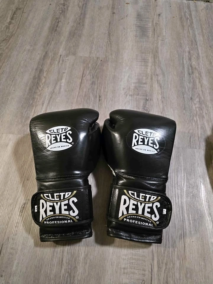 Selling a professional-grade boxing kit due to relocation. These are authentic, Mexican-made Cleto Reyes 18oz Hook & Loop training gloves in Black with Gold trim.