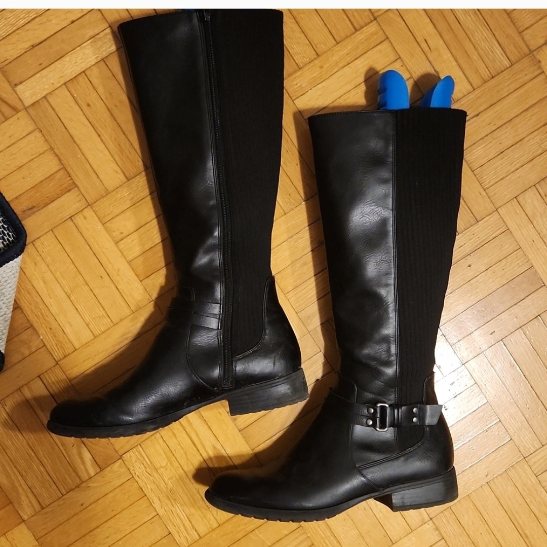 Selling a pair of black tall boots. They are in very good condition and have a stylish buckle detail. Perfect for fall and winter!