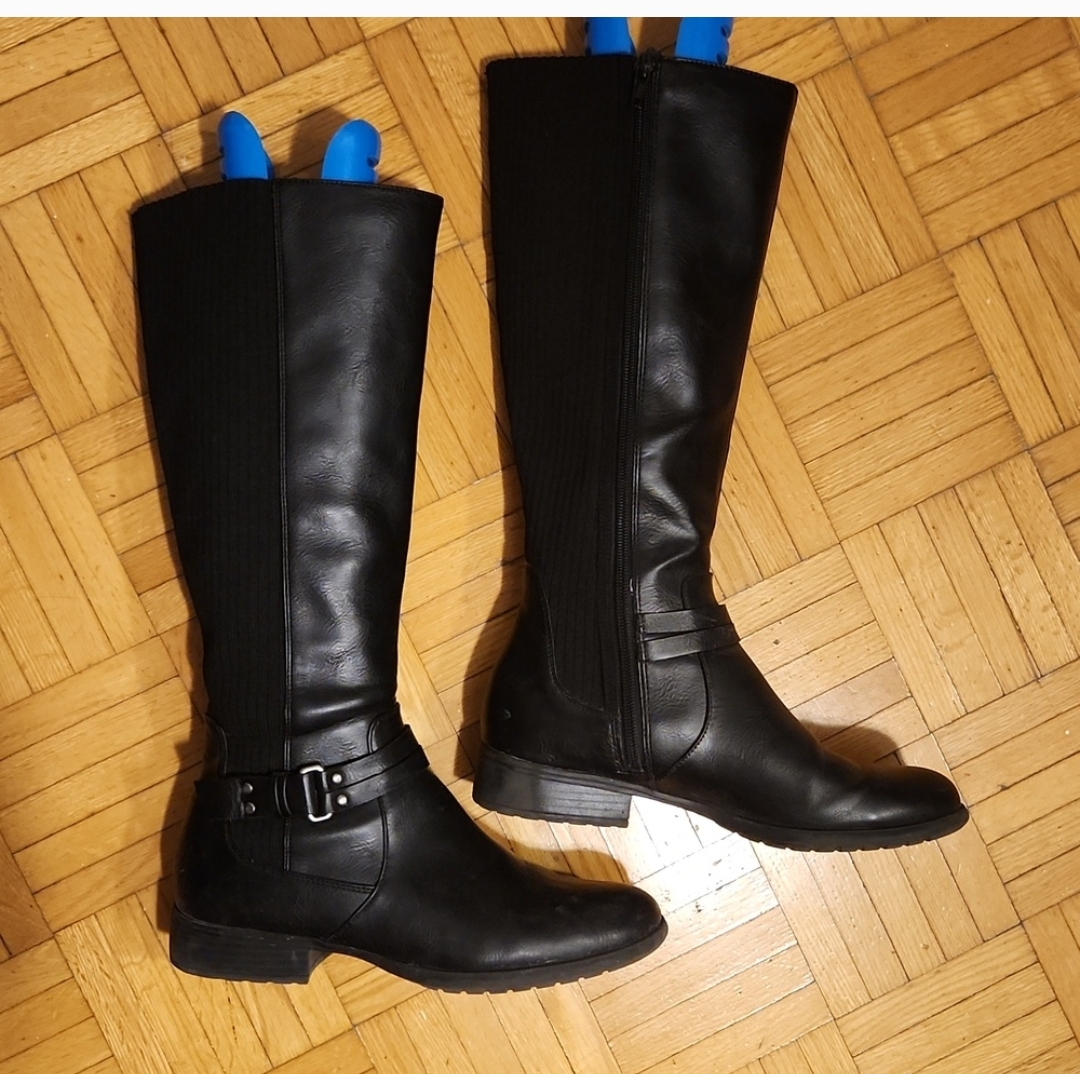 Selling a pair of black tall boots. They are in very good condition and have a stylish buckle detail. Perfect for fall and winter!