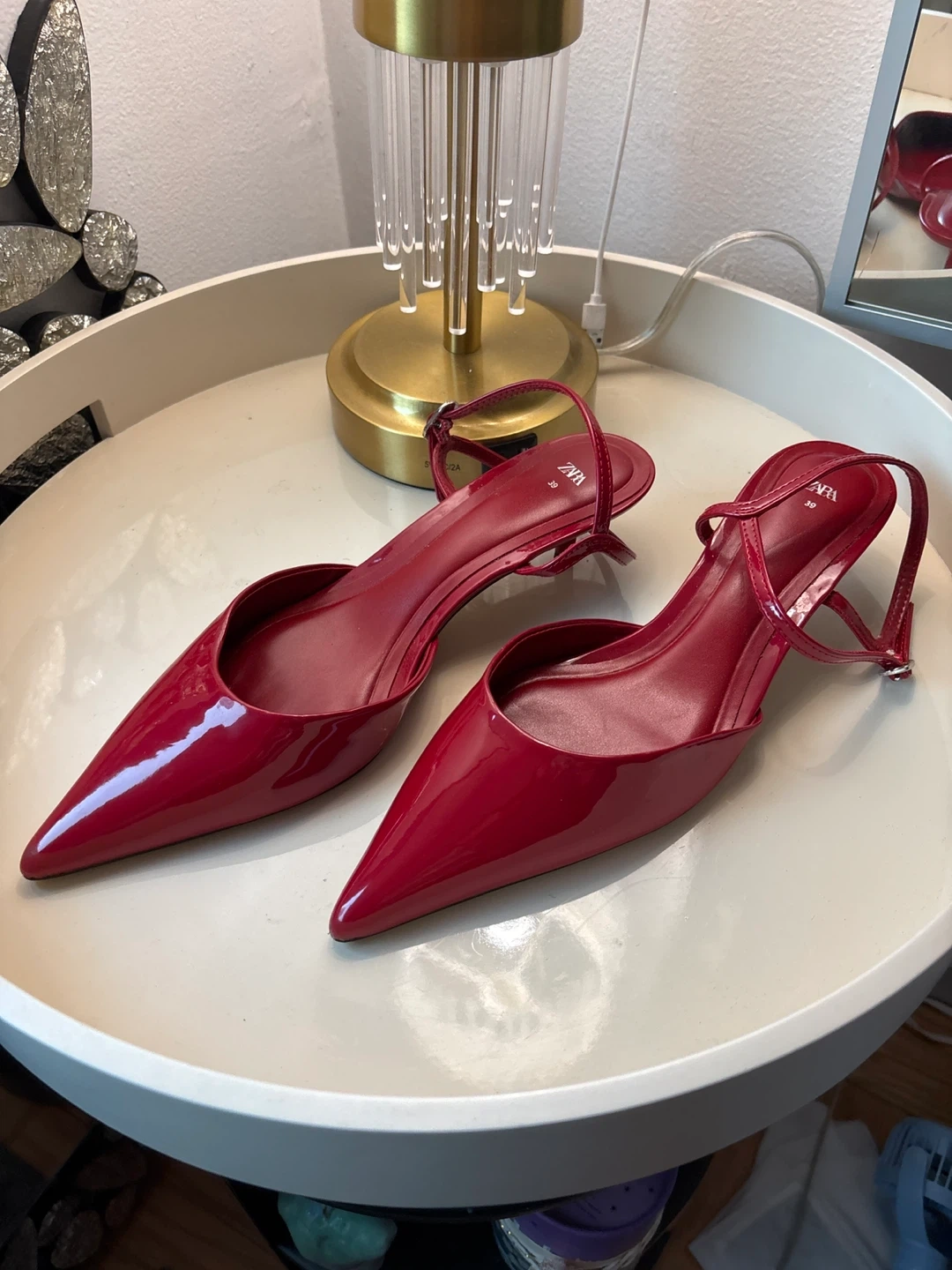 Selling a pair of Zara slingback heels in a vibrant red color! These heels are a size 39. They're perfect for adding a pop of color to any outfit! The material is patent leather.