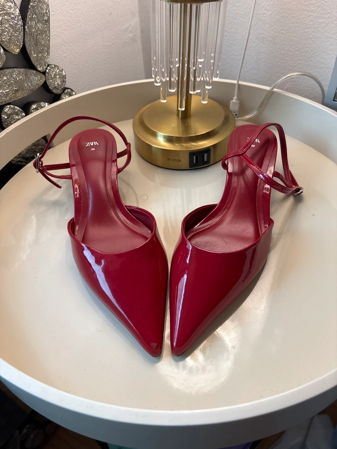 Selling a pair of Zara slingback heels in a vibrant red color! These heels are a size 39. They're perfect for adding a pop of color to any outfit! The material is patent leather.