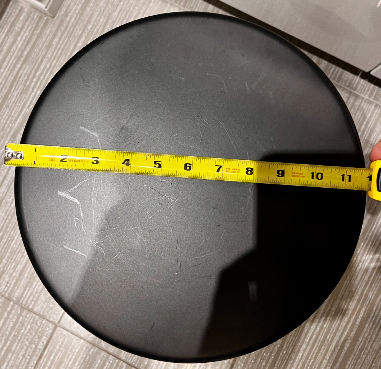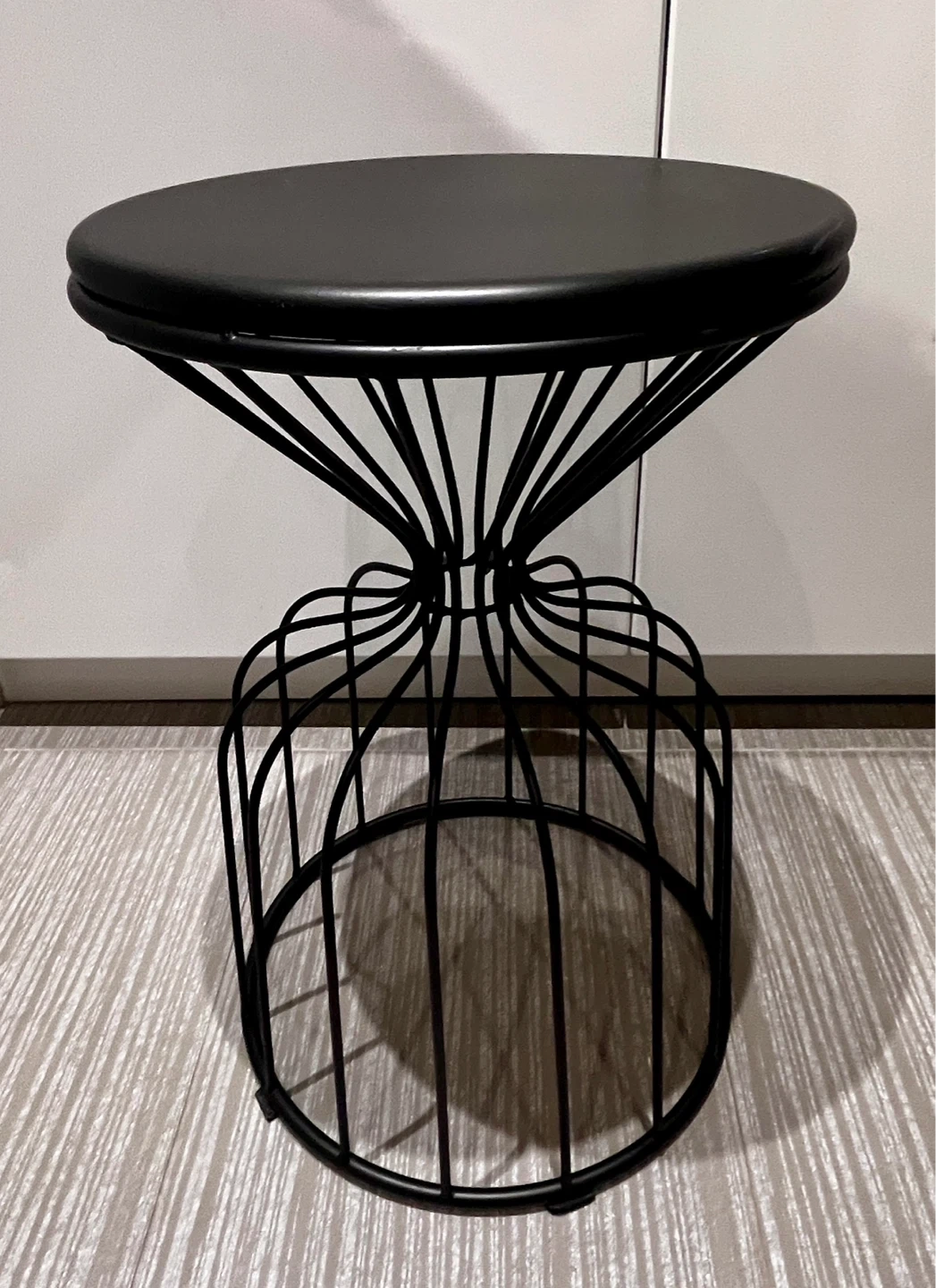 Black metal accent table with a wire cage base. Top diameter is about 12 inches, and it's around 18 inches tall. This table adds a stylish touch to any room!