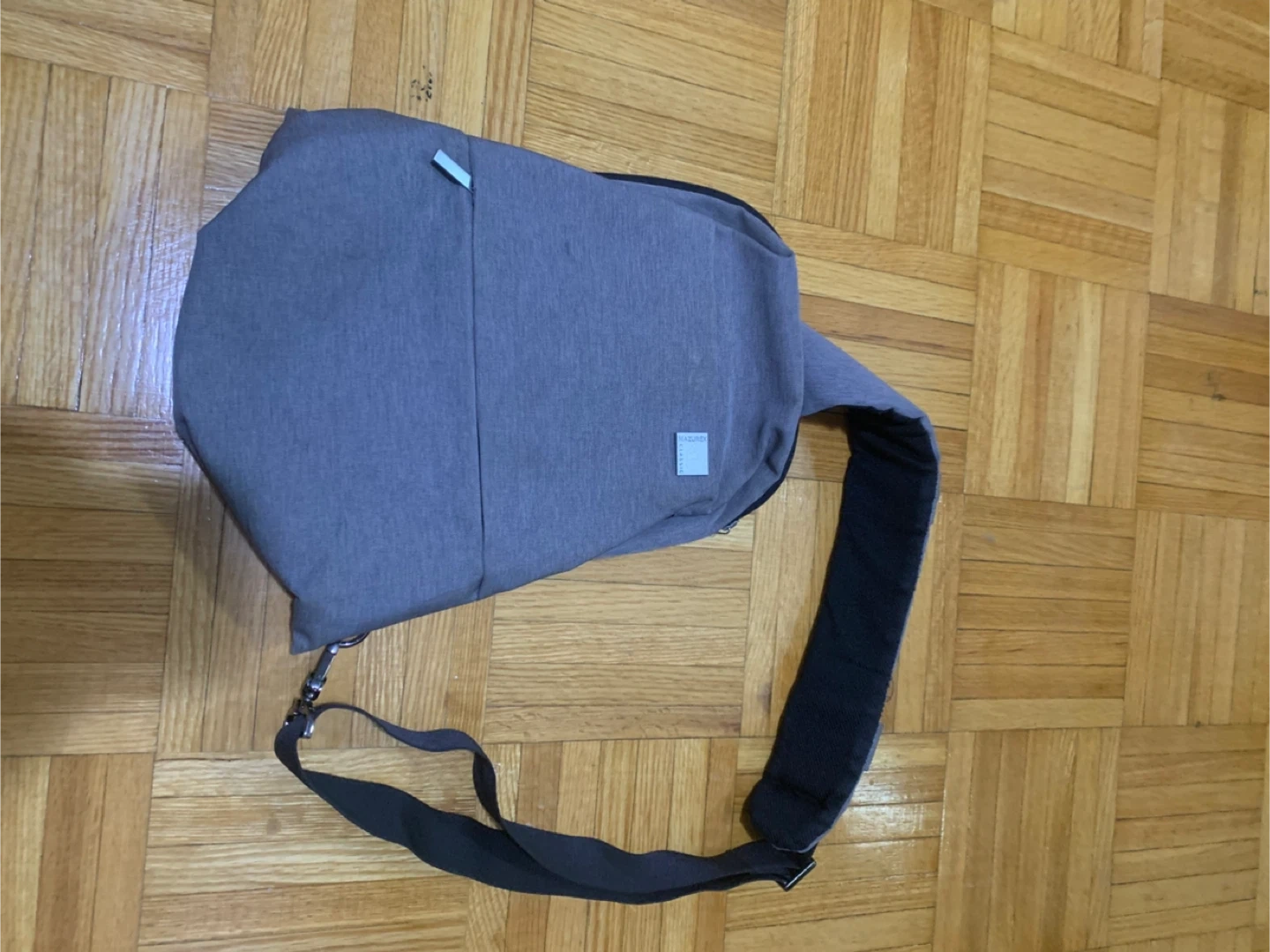 This is a grey MATERIX sling bag. It's made of durable fabric with an adjustable strap. Multiple pockets offer convenient storage for daily essentials.