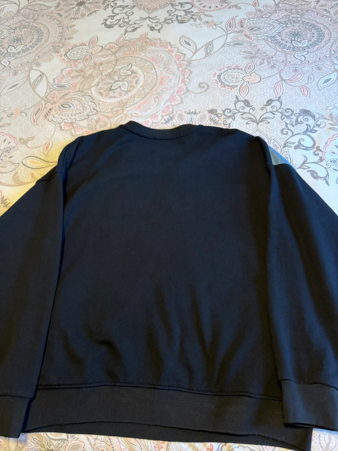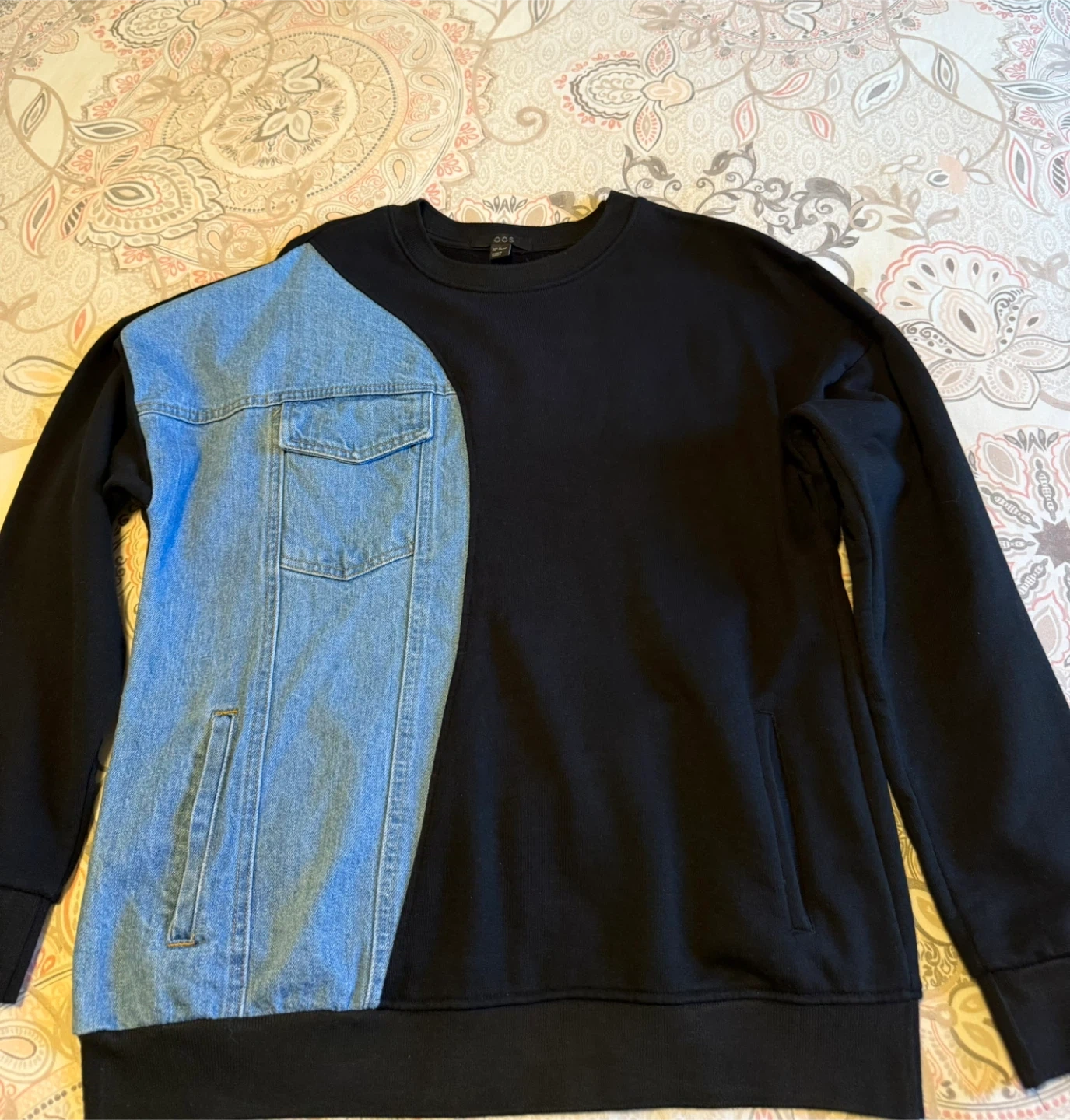Selling a unique black sweater with denim detailing on one side. It features a crew neck and pockets on both sides. A stylish and comfortable piece to add to your wardrobe! Never worn but no tags. Been sitting in the closet. Size medium.