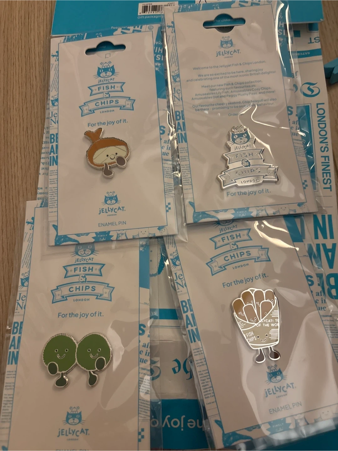 I have some brand new Jellycat Fish & Chips enamel pins for sale! They're super cute and would look great on a bag or jacket. Each pin comes in its original packaging.