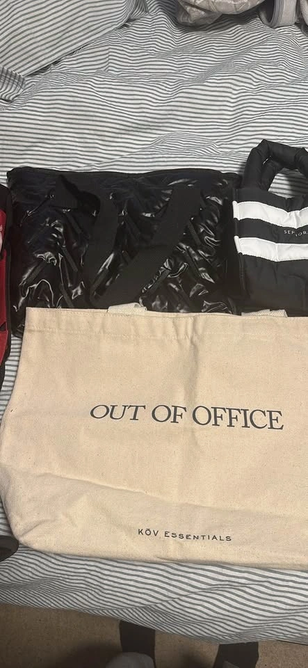 Versatile bag lot available! Includes a red goodlife duffel bag, a black puffy Sephora bag, another black puffy tote, a beige 'Out of Office' KÖV Essentials canvas bag, and a black Garage mesh bag etc.. Great for travel, shopping, or everyday use. Take all for $10. PPU manning and anderson.