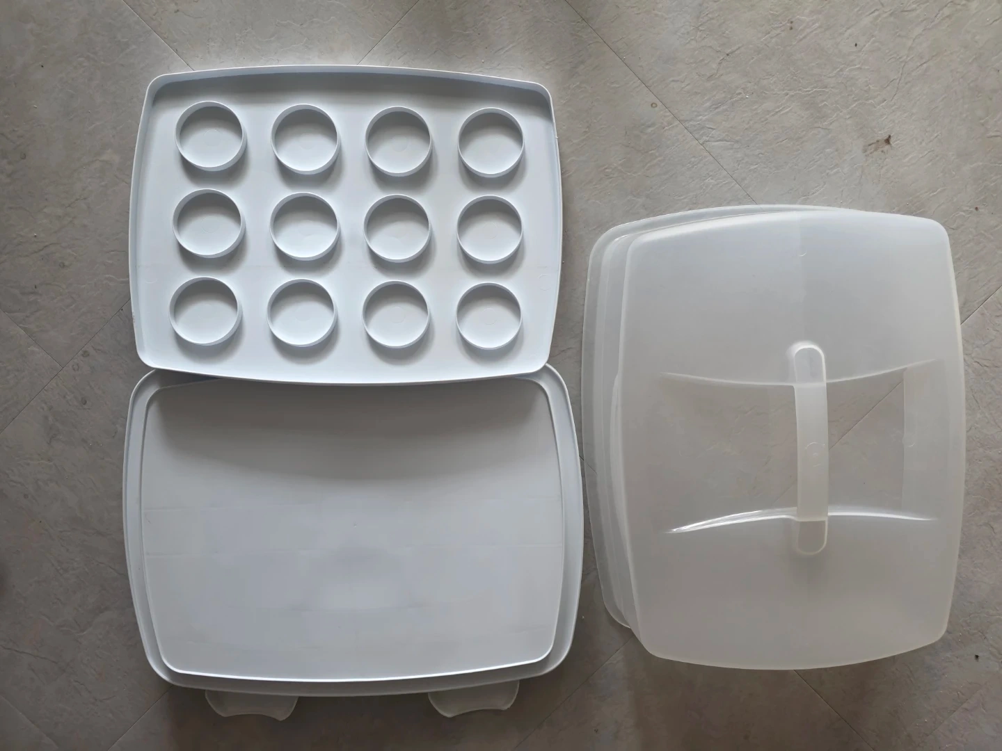 This 2-tier carrier holds up to 24 cupcakes with individual cradles. It's made of white plastic and includes a clear lid with a handle for easy transport. The bottom tray is also designed to hold larger items like pies or cakes.