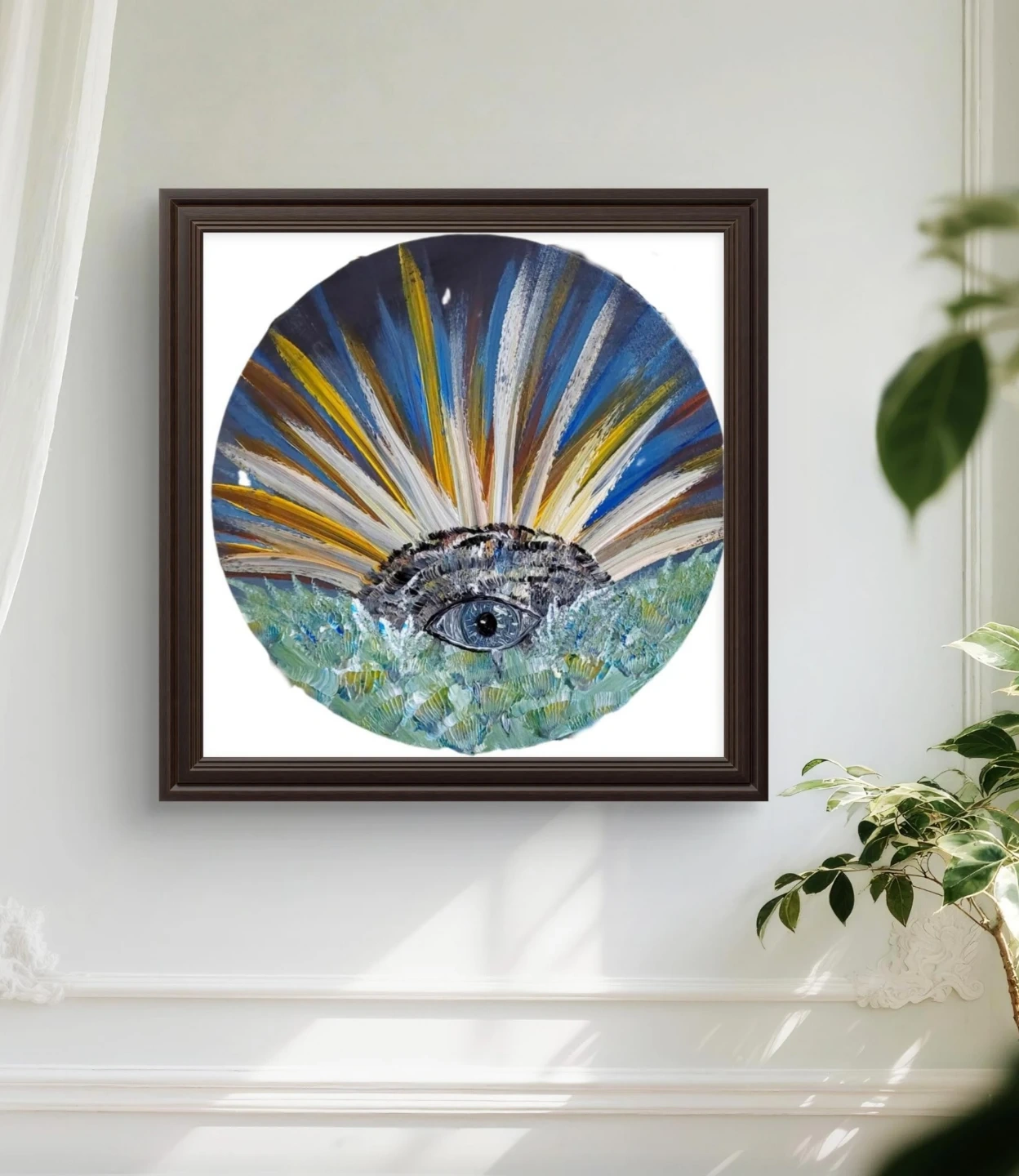 This wall art is a unique, round-shaped piece of art. It features a central eye motif surrounded by a stylized sunburst pattern in various colours like yellow, blue, and white against a dark background. The lower portion depicts a textured green landscape. The artwork is hand-painted.