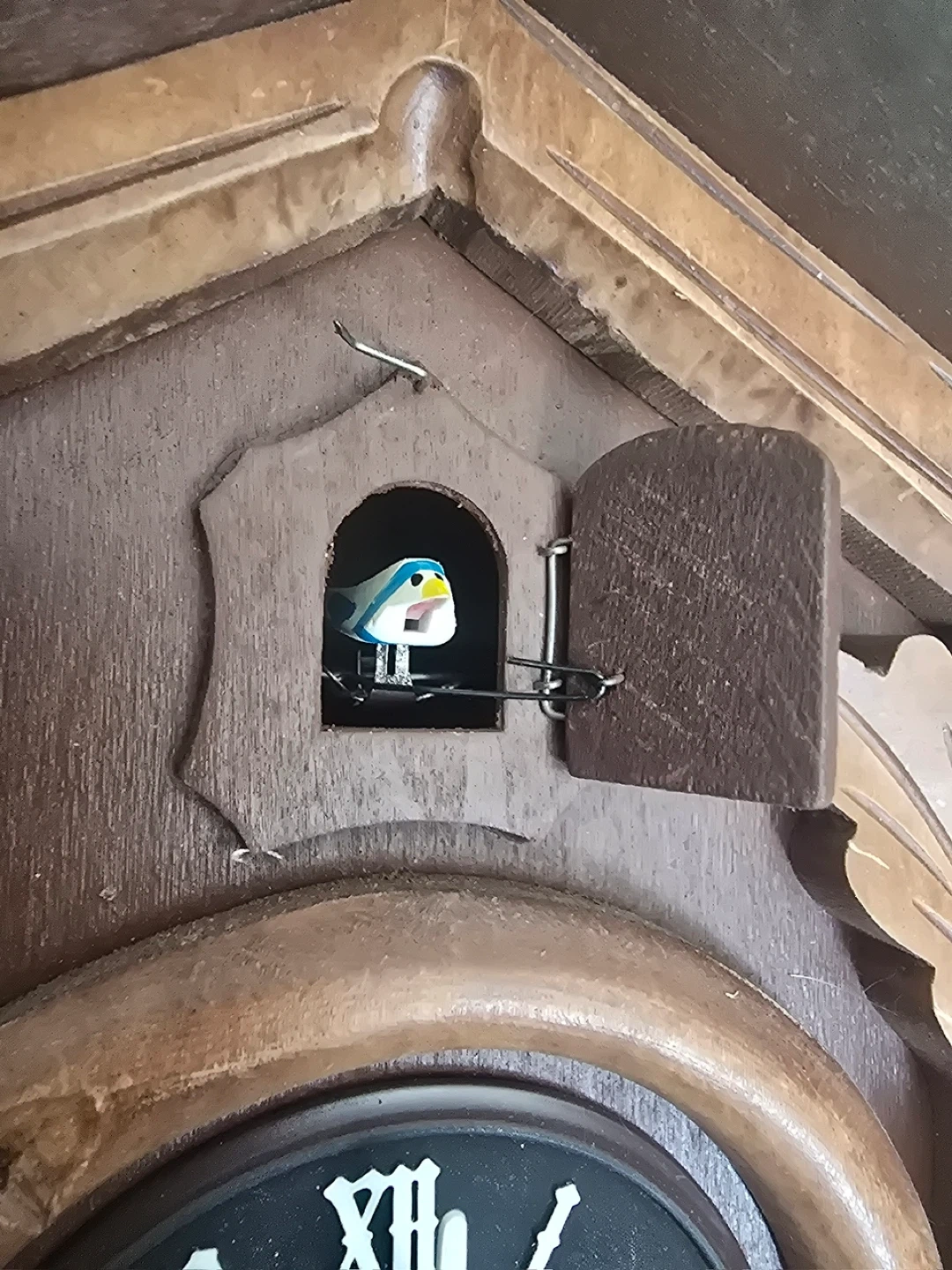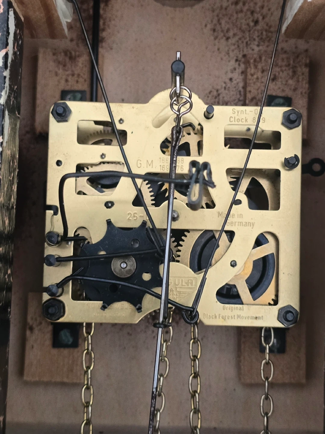 A classic cuckoo clock from West Germany. It features detailed wood carving and a traditional Roman numeral clock face. Includes pinecone weights and pendulum.