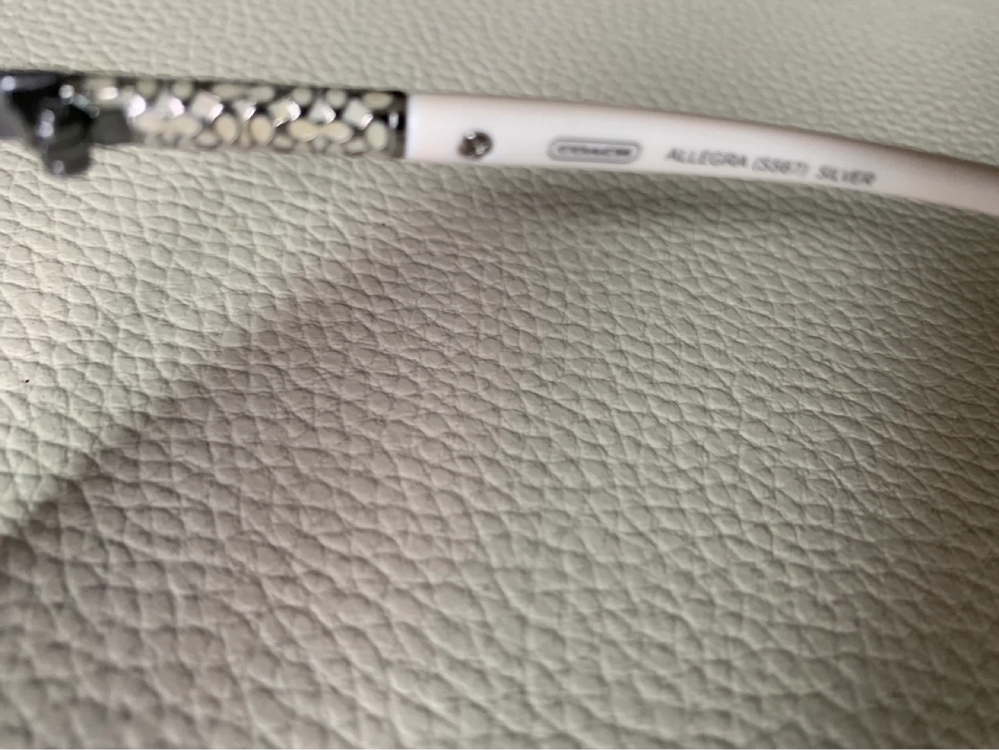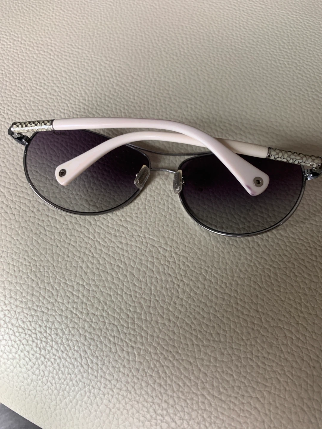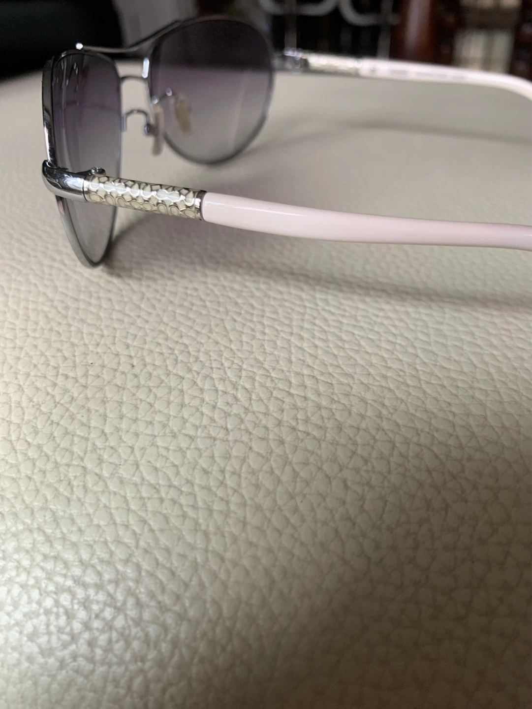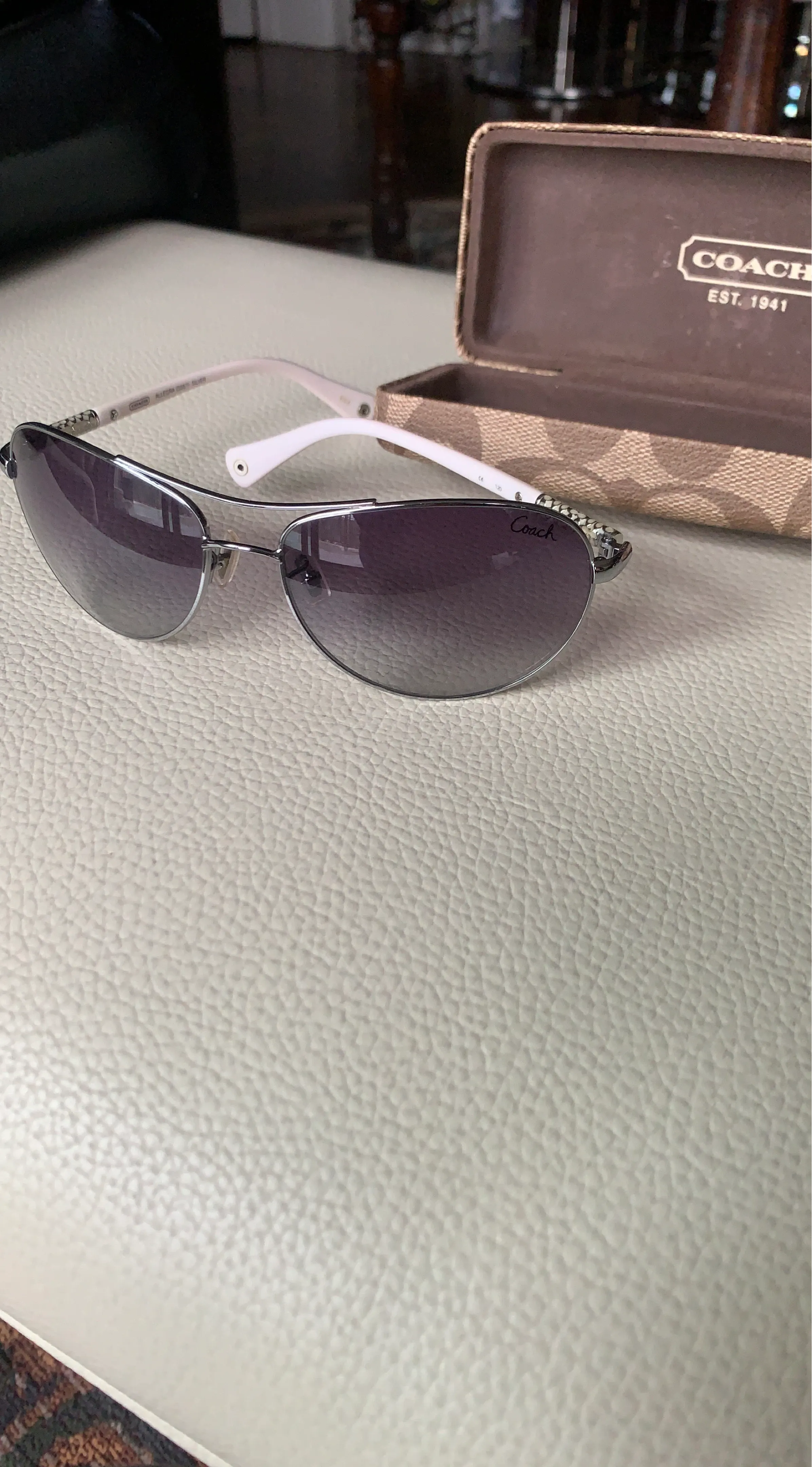 These are Coach Allegra S387 sunglasses in silver. They feature a stylish design with white arms and gradient lenses. Comes with original Coach case. Great for sunny days!
