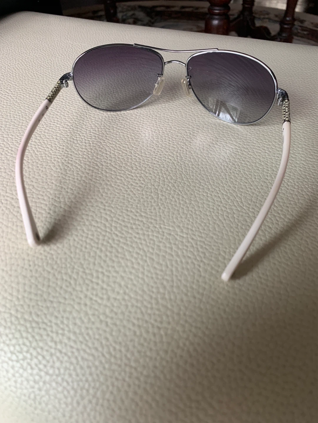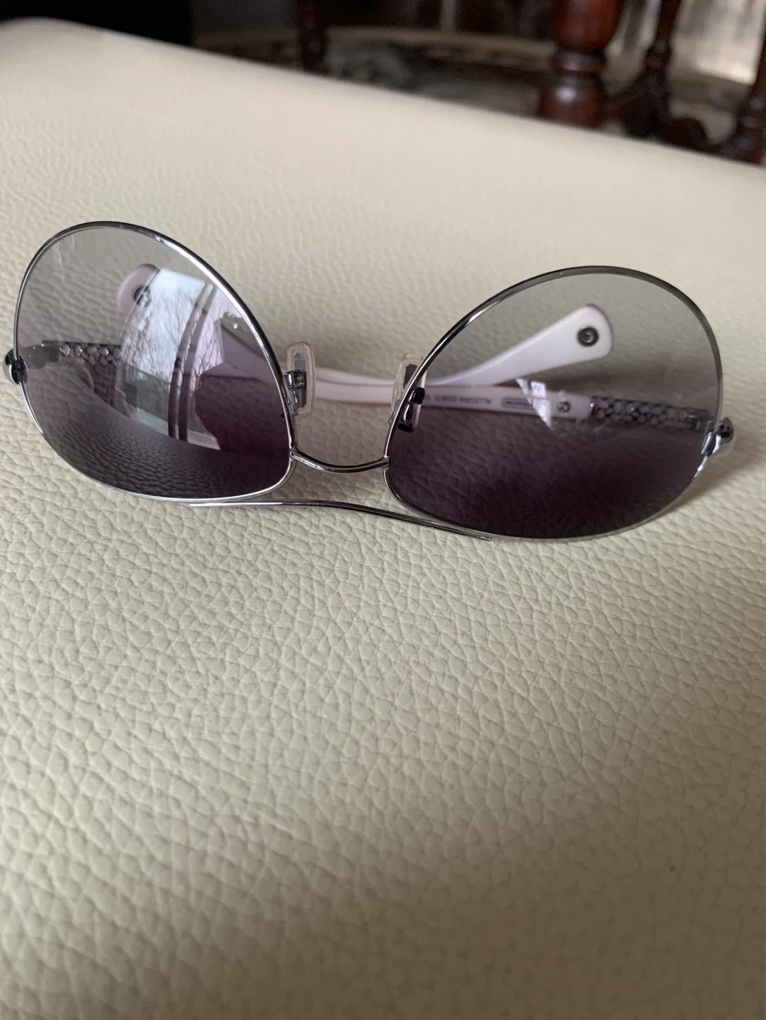 These are Coach Allegra S387 sunglasses in silver. They feature a stylish design with white arms and gradient lenses. Comes with original Coach case. Great for sunny days!
