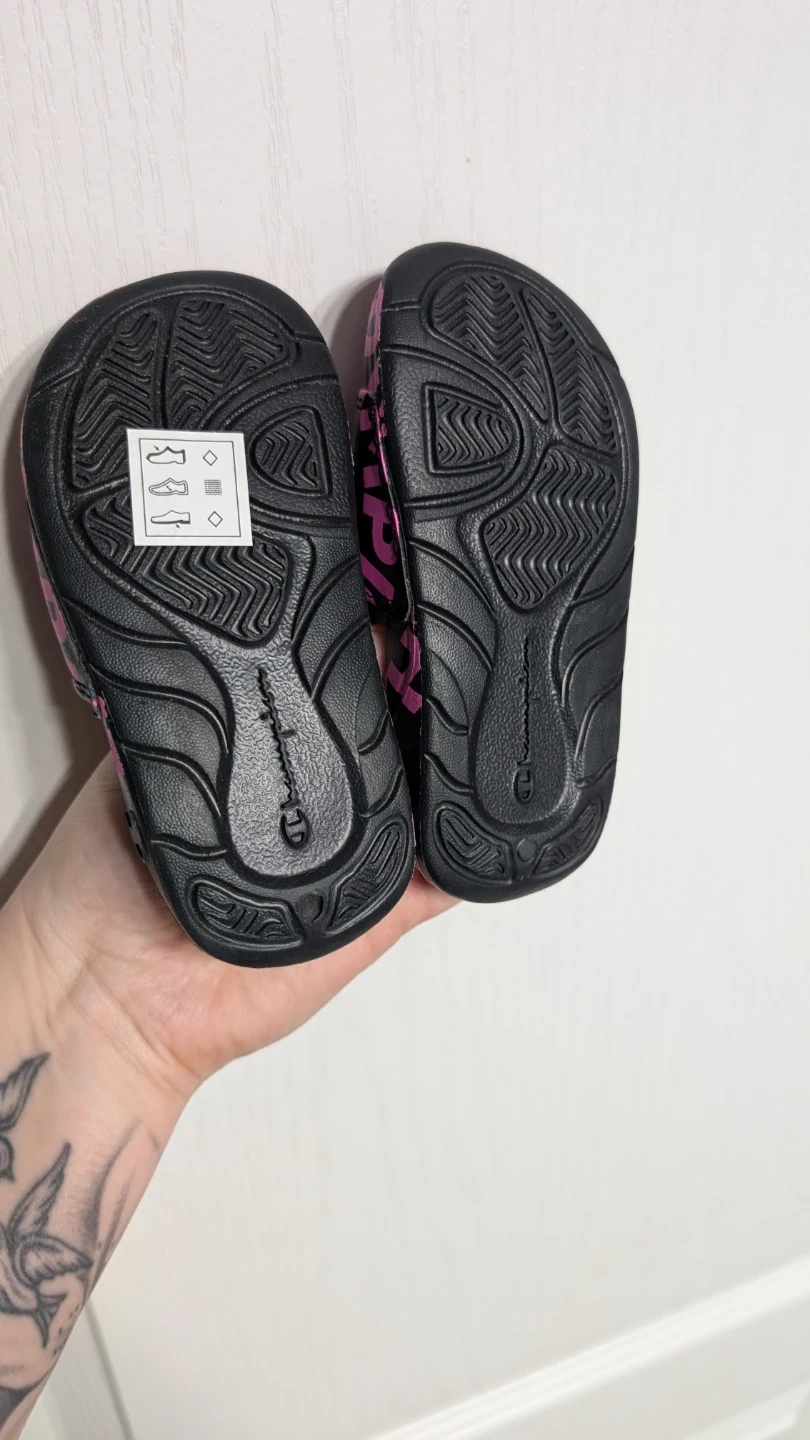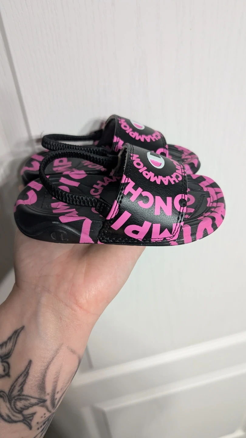 Black and pink Champion logo slides for toddlers. Comfortable slip-on design with an adjustable heel strap. Perfect for warm weather fun!