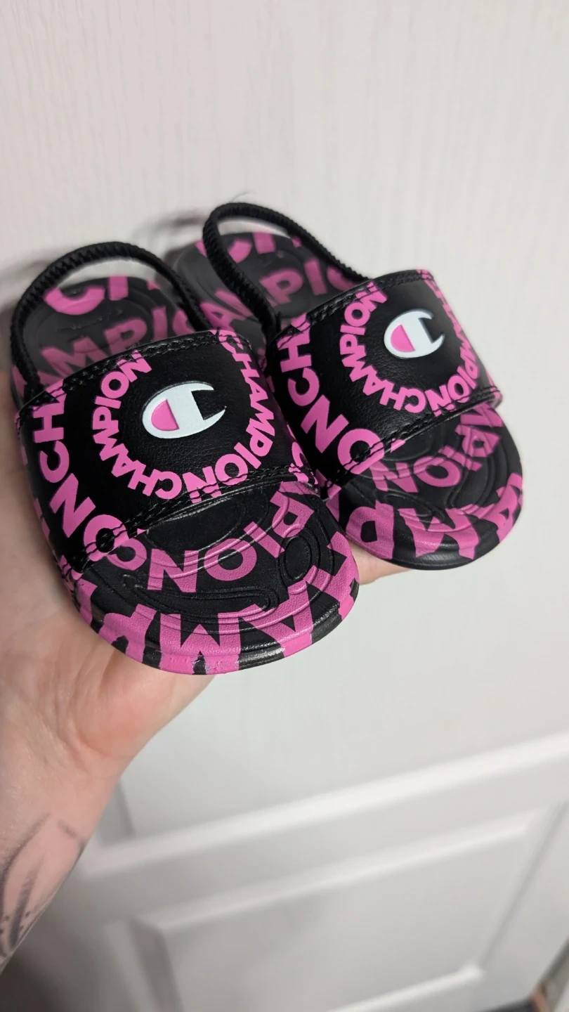 Black and pink Champion logo slides for toddlers. Comfortable slip-on design with an adjustable heel strap. Perfect for warm weather fun!