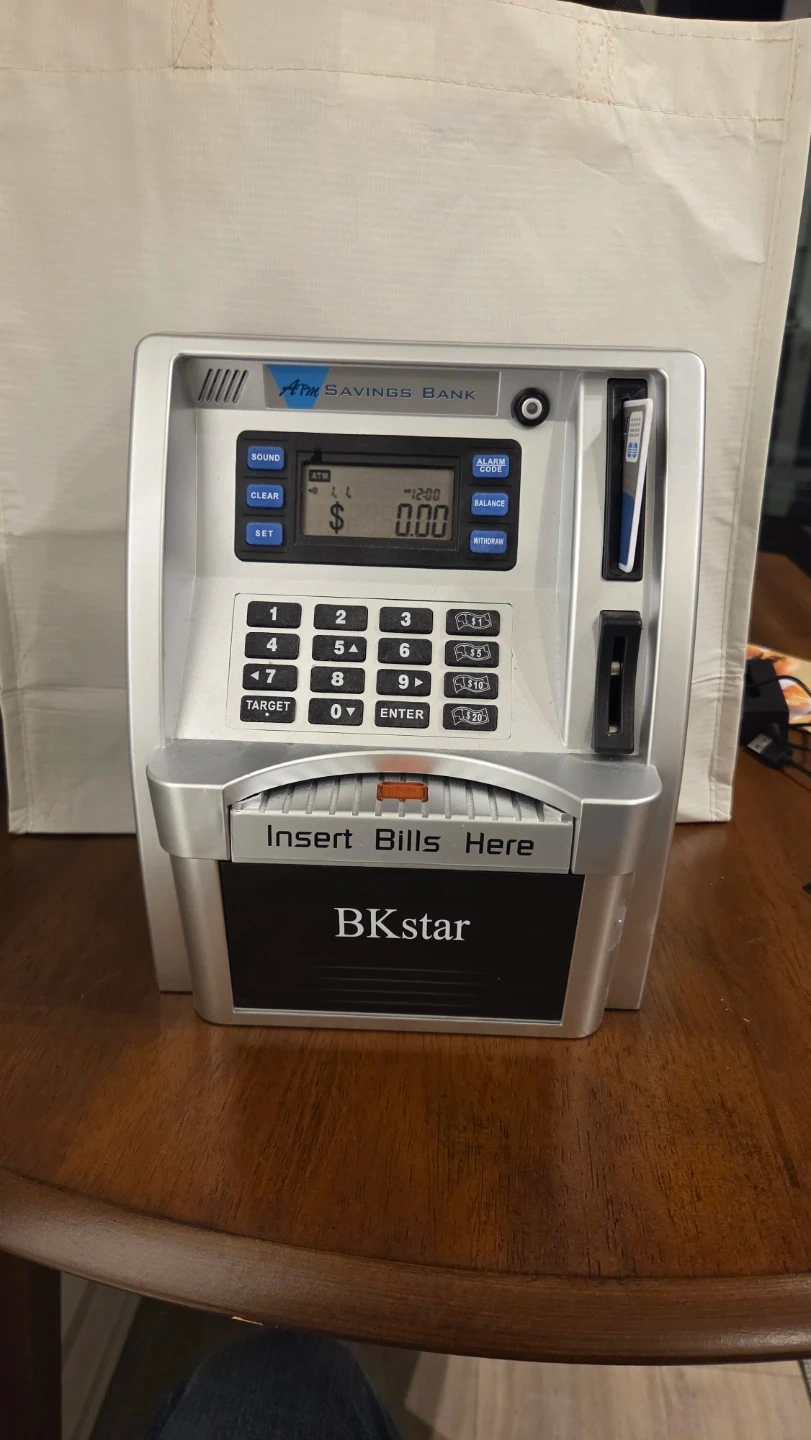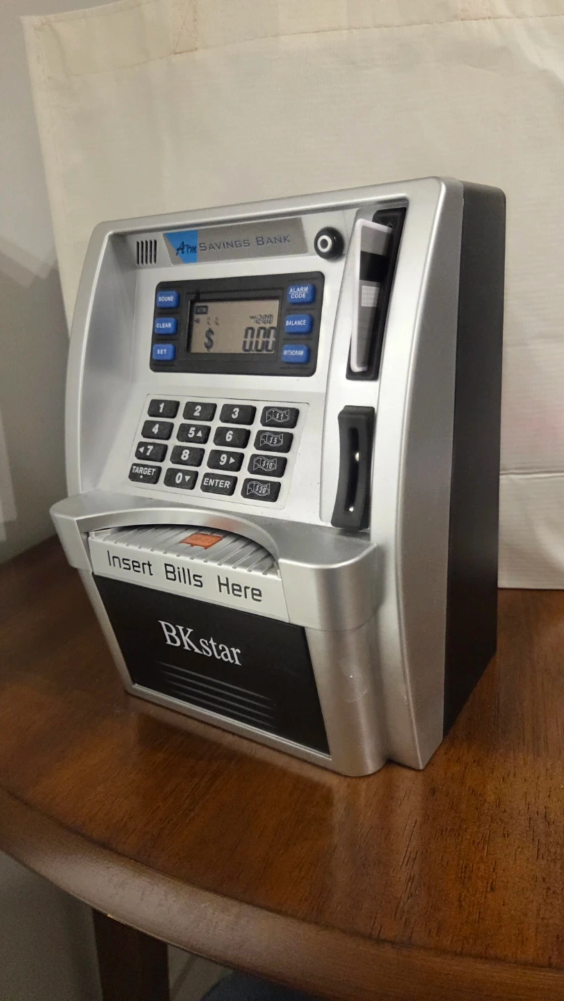 This is a BKstar ATM savings bank. It has a digital display and a keypad for entering codes and amounts. Insert bills here for saving.