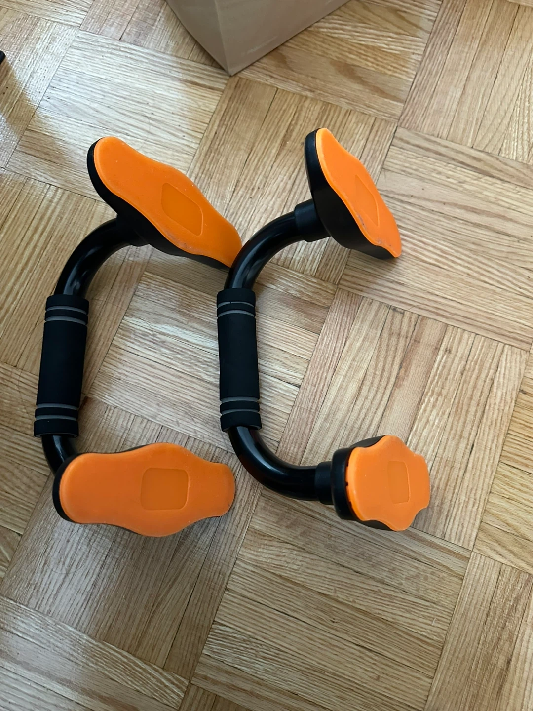 GOZONE push up bars with orange bases and black padded grips. They're designed for strength training and provide a comfortable and stable workout. These bars are great for home gyms!