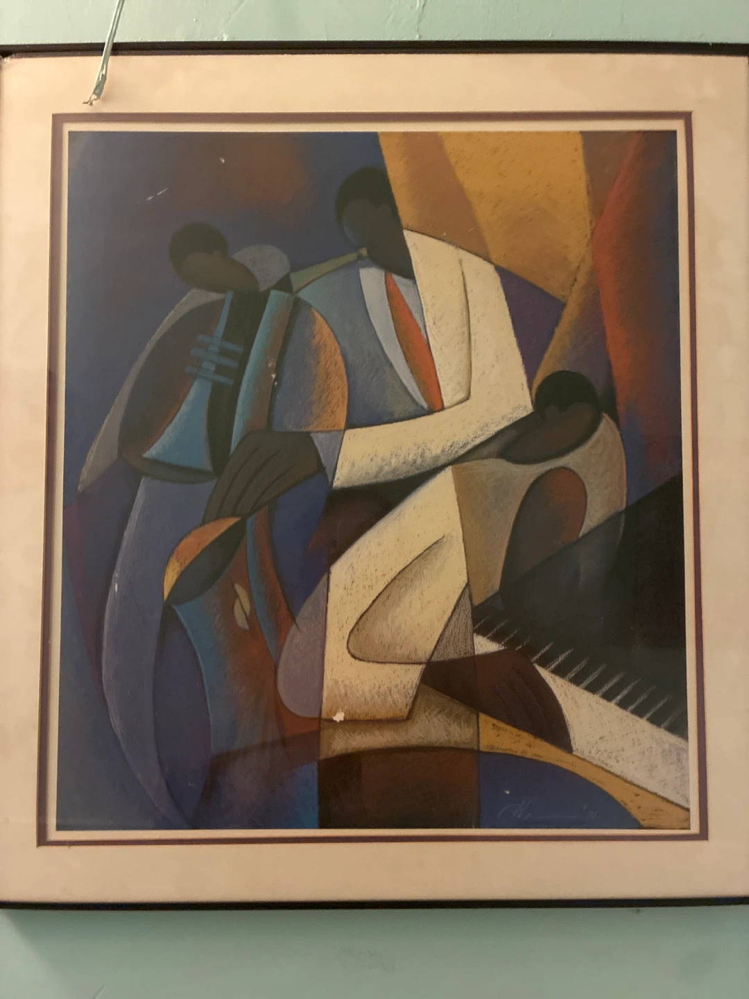 This framed art print depicts a group of jazz musicians playing their instruments. The abstract style features bold colors and geometric shapes. It's matted and ready to hang. Perfect for adding a touch of sophistication to any room!