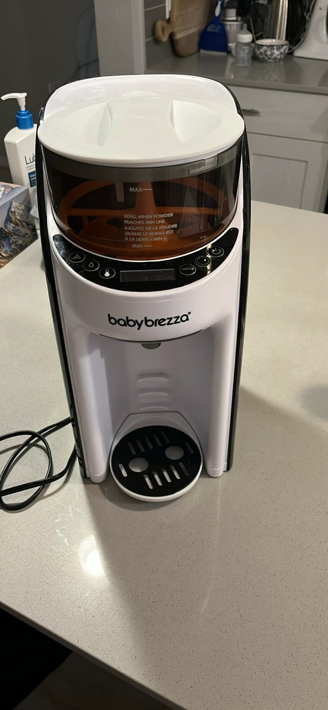 This Baby Brezza Formula Pro Advanced is white and black. It automatically dispenses formula and water to the perfect consistency. Refill the powder when it reaches the min line.