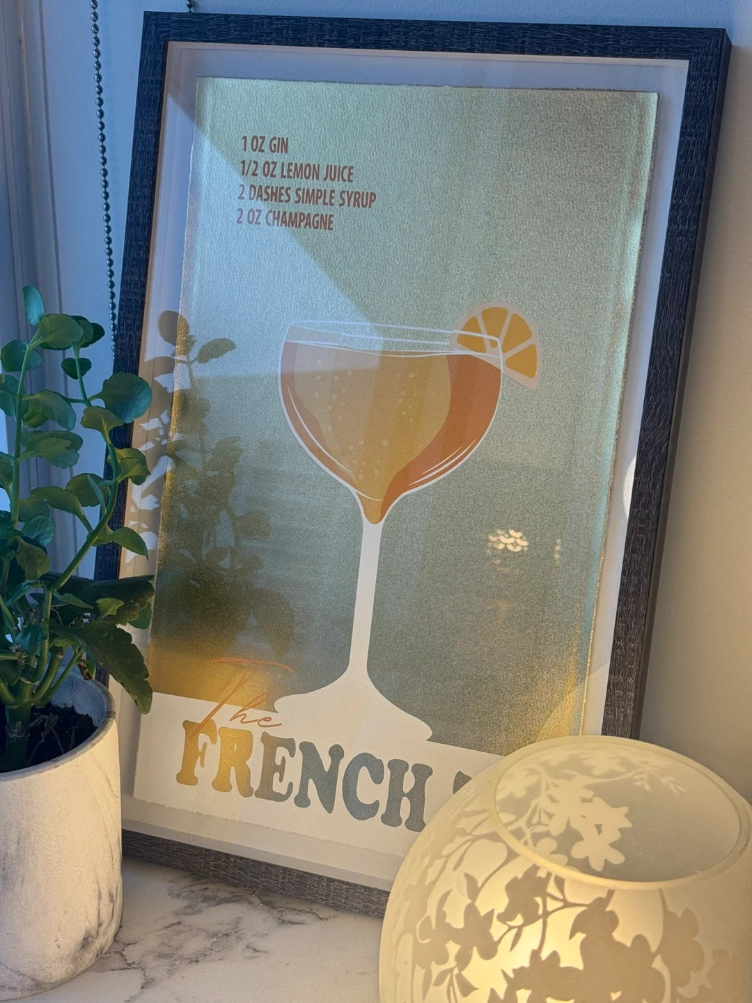 Stylish framed cocktail art print featuring The French 75 recipe, perfect for elevating a home bar, kitchen, dining area, or condo living space. The soft neutral tones and minimalist illustration add a modern, curated look without overpowering the room.