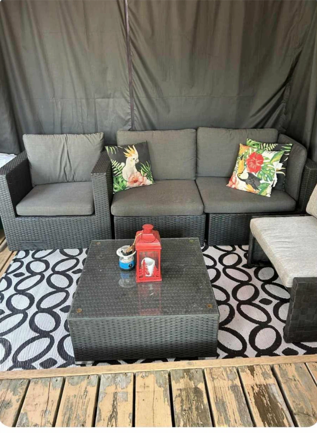 Selling a comfy outdoor wicker patio set! It includes a sofa, chairs, area rug and a coffee table. The cushions are a neutral grey colour and in good condition. Perfect for enjoying those warm summer evenings on your deck or patio