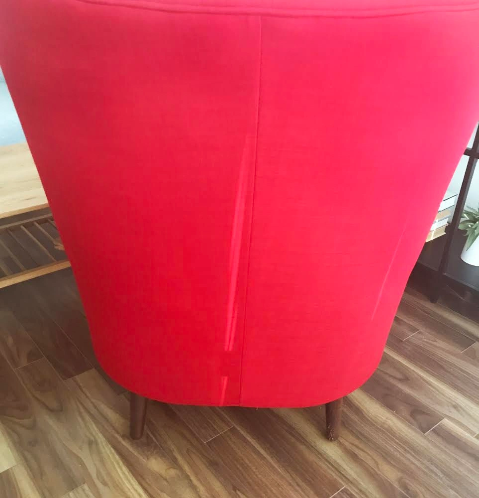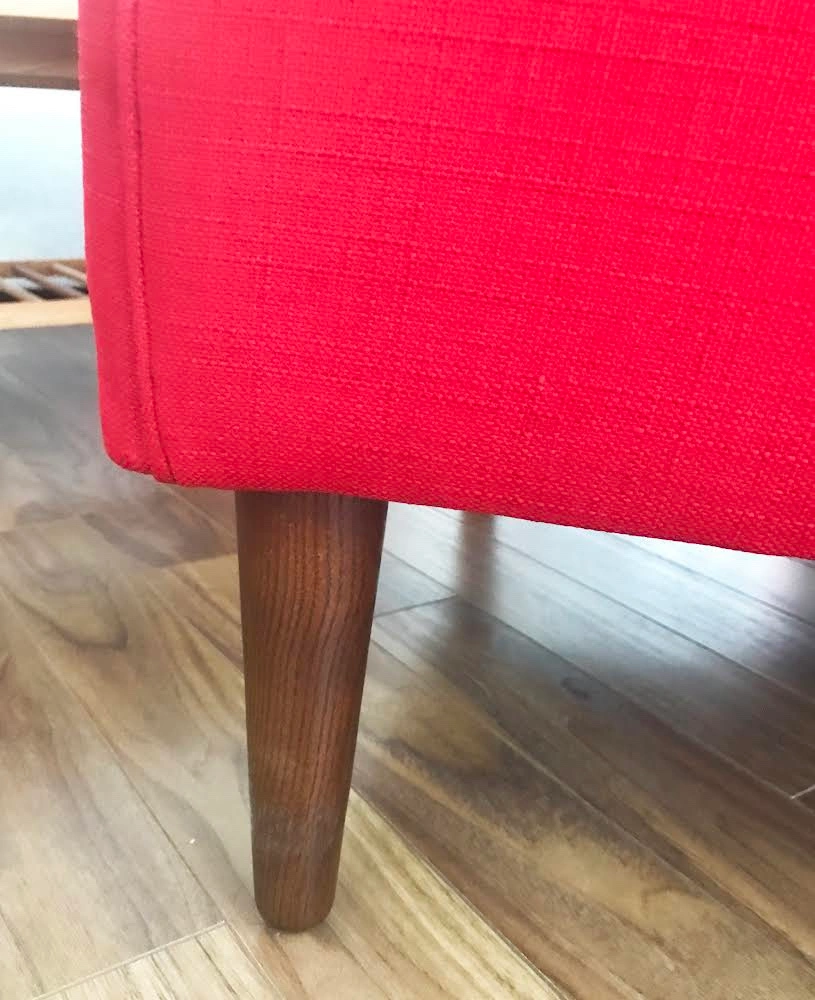Comfortable armchair in a rich red fabric. The armchair will come with the legs removed unless you request otherwise. I don’t have a car so you must be able to pick it up.