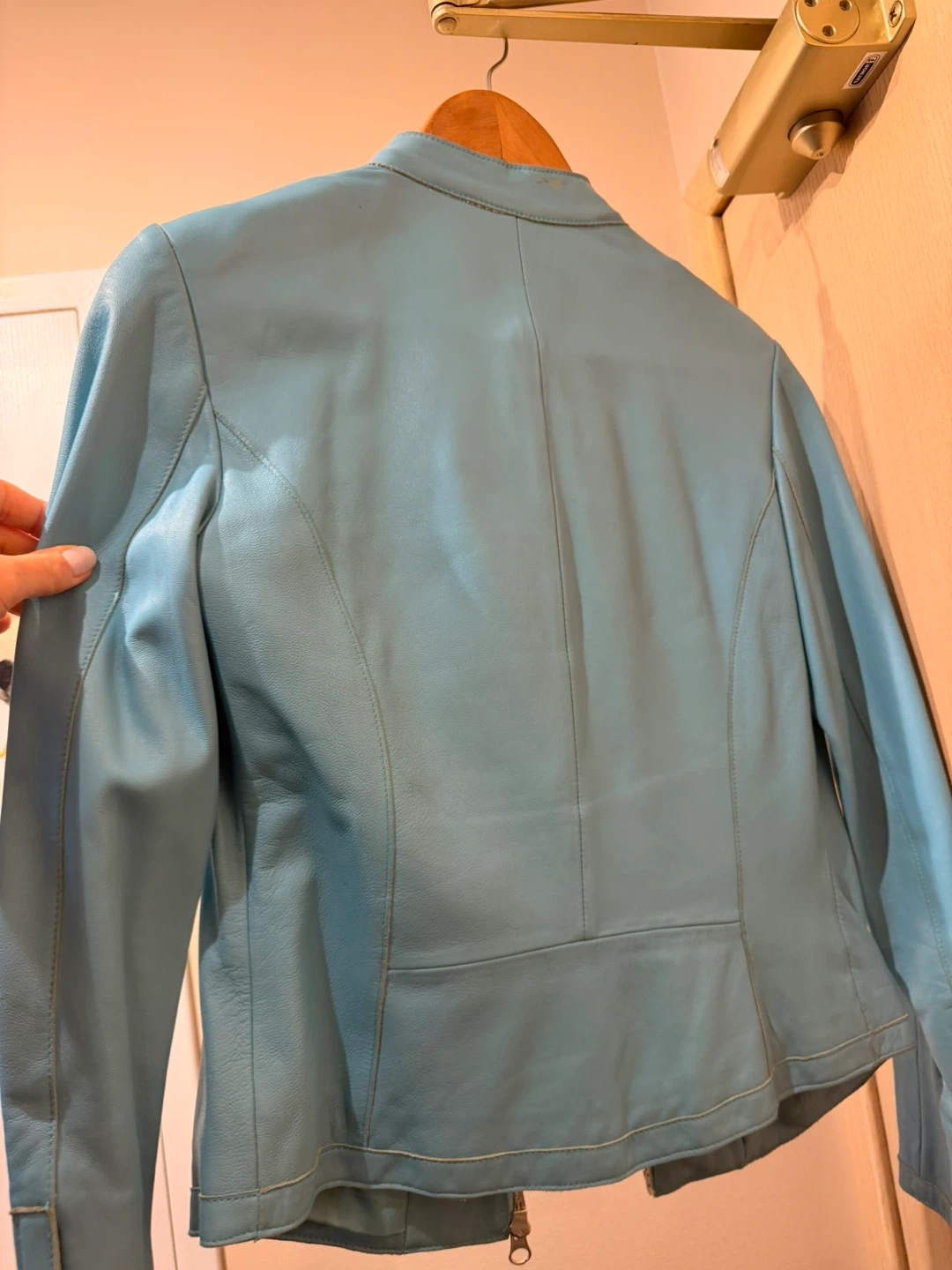 Selling a lovely Danier leather jacket in a beautiful light blue colour. The jacket is a size P, which is equivalent to a size 4-6. It's in great condition and ready for a new owner!