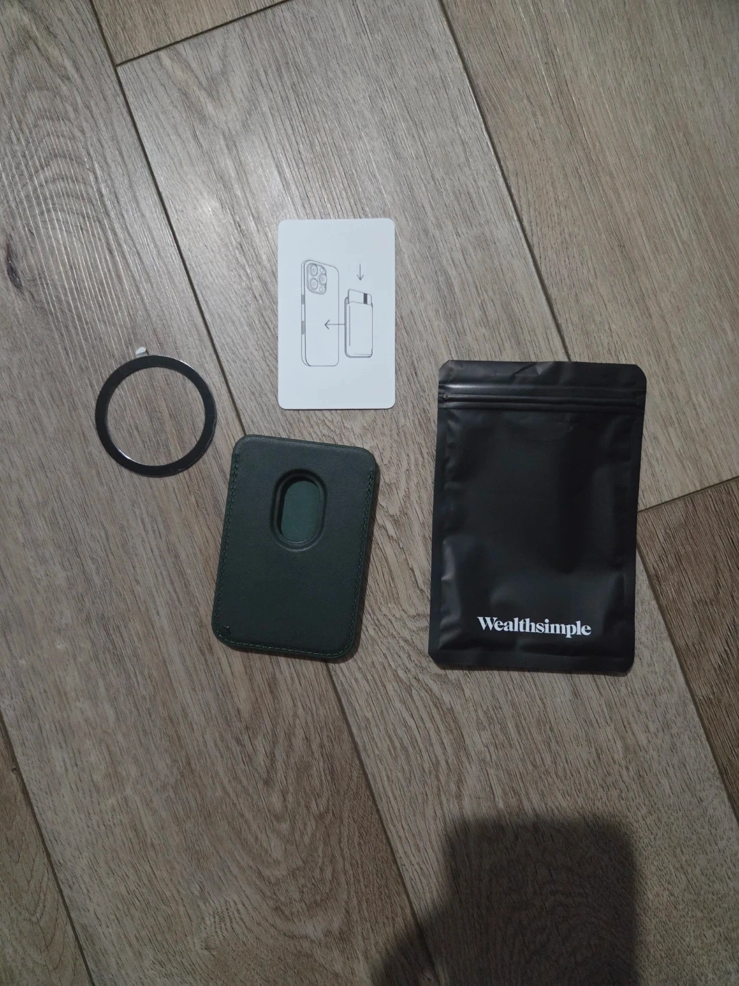 This is a Wealthsimple card holder with a magnetic ring for iPhone 17. It's a convenient accessory for keeping your cards secure. Made from faux leather.