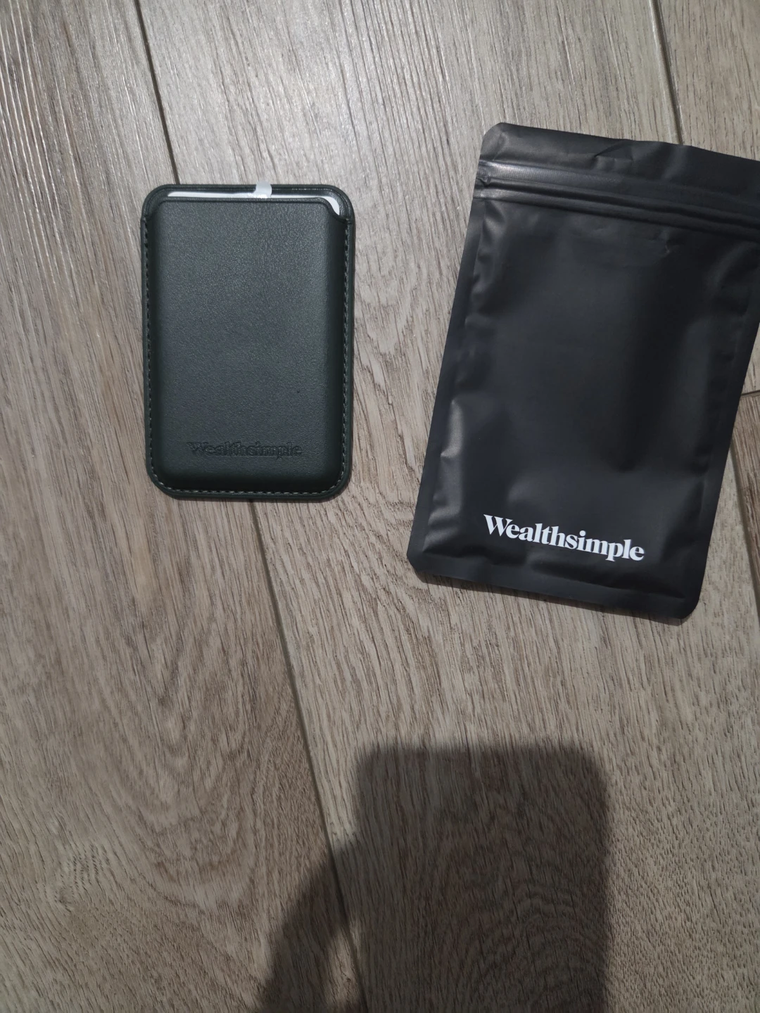This is a Wealthsimple card holder with a magnetic ring for iPhone 17. It's a convenient accessory for keeping your cards secure. Made from faux leather.