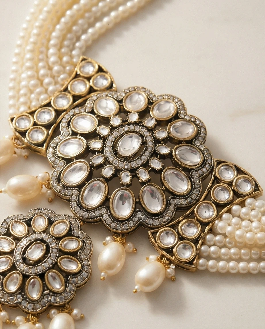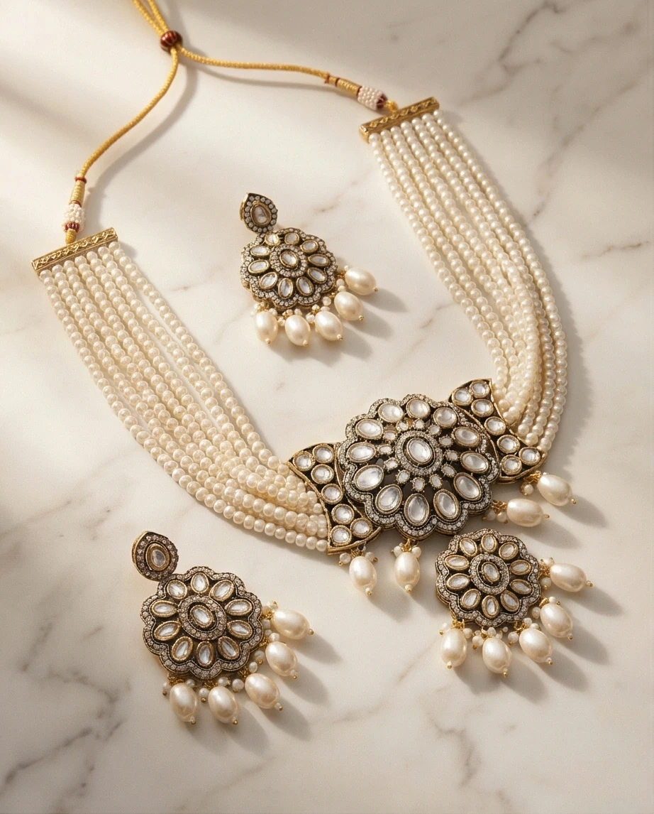 Beautiful multi-strand pearl choker necklace paired with matching dangling earrings. Features ornate central pendants adorned with clear gemstones and pearl drops. This set adds elegance to any special occasion look!