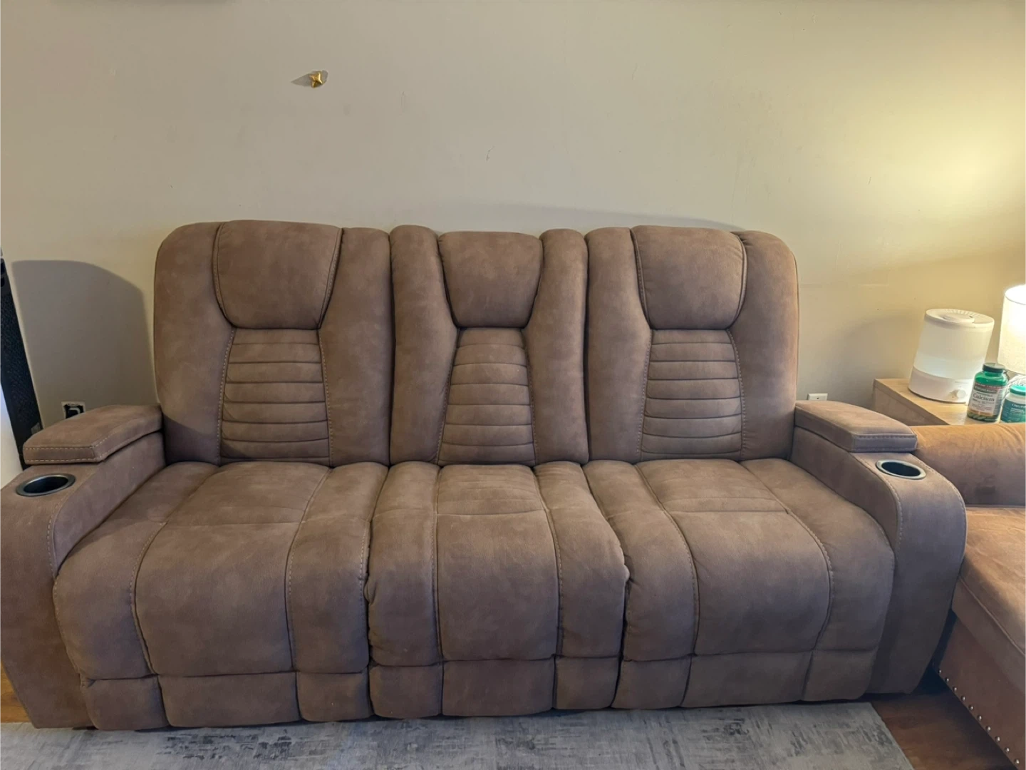 Three-seater reclining sofa in a brown faux suede fabric. It features multiple reclining positions and cupholders built into the armrests. Comfortable seating for the whole family!