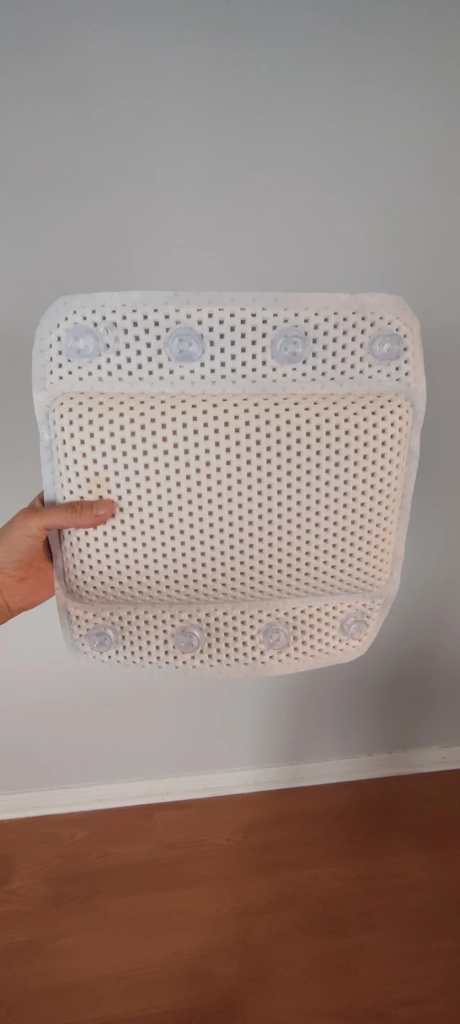 This bath pillow is made of a soft, mesh material. It attaches to the tub with suction cups. It's designed for extra comfort while bathing.