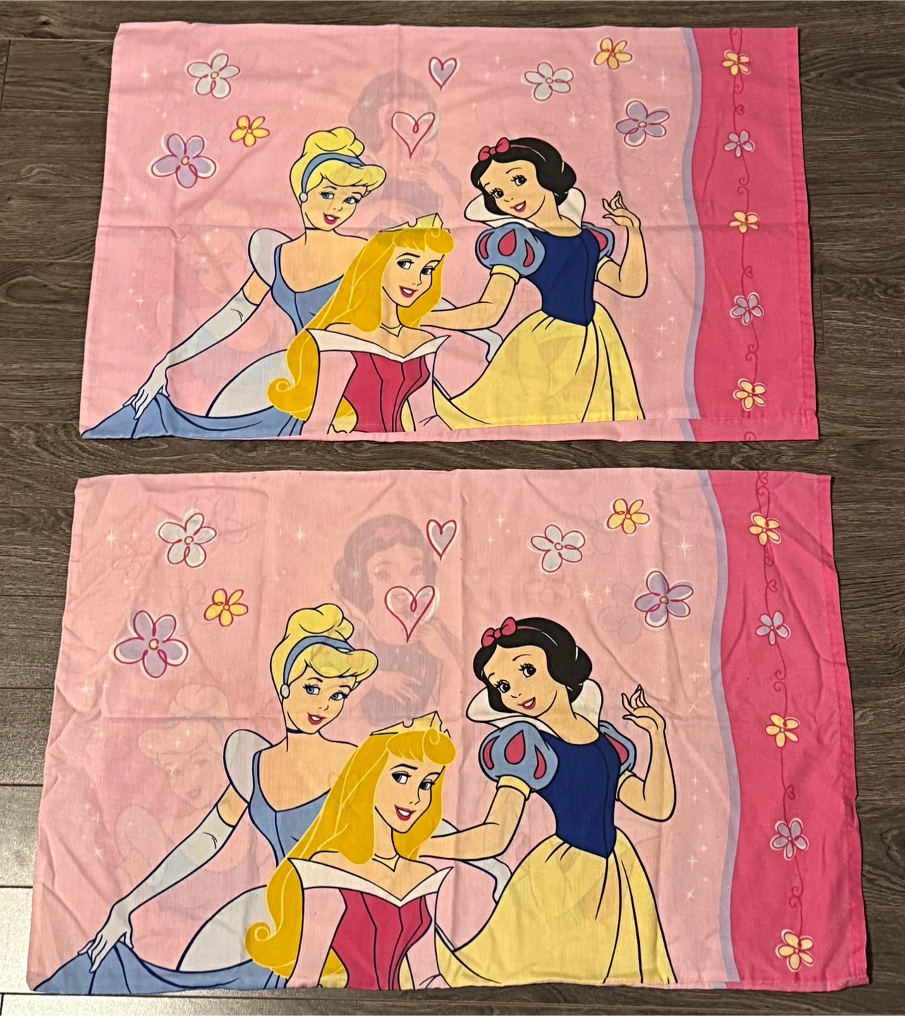 Set of two adorable Disney Princess vintage pillowcases! They feature Cinderella, Aurora, and Snow White on a pink background with flowers and hearts.