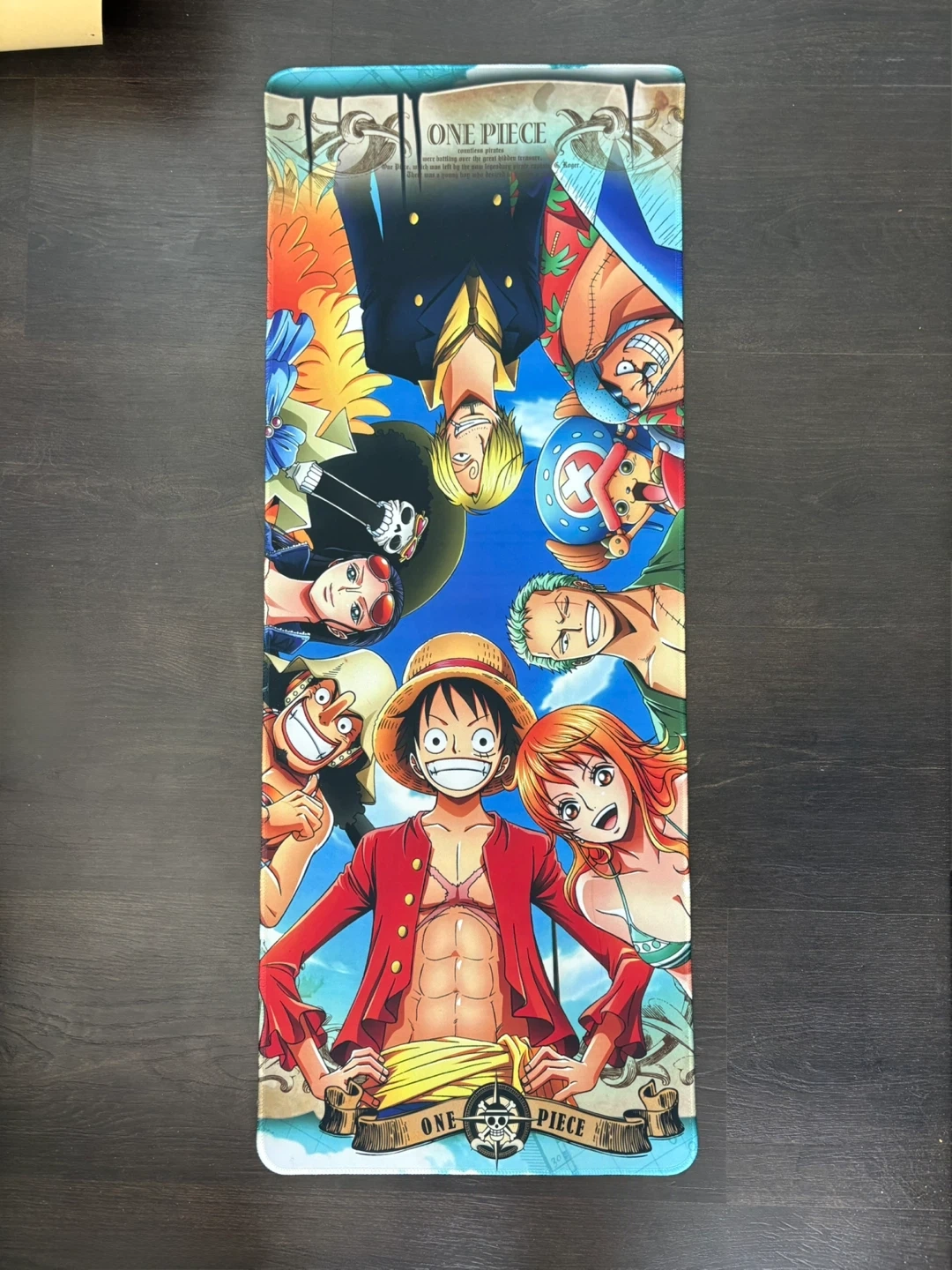 This is a large mouse pad featuring characters from the popular anime, One Piece. It's made from a durable material. Not used at at all.