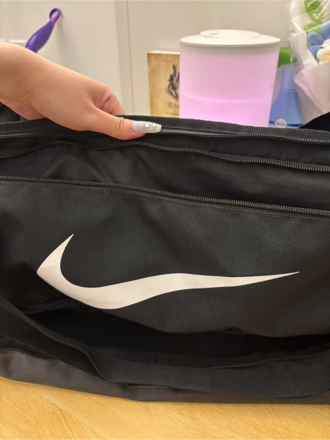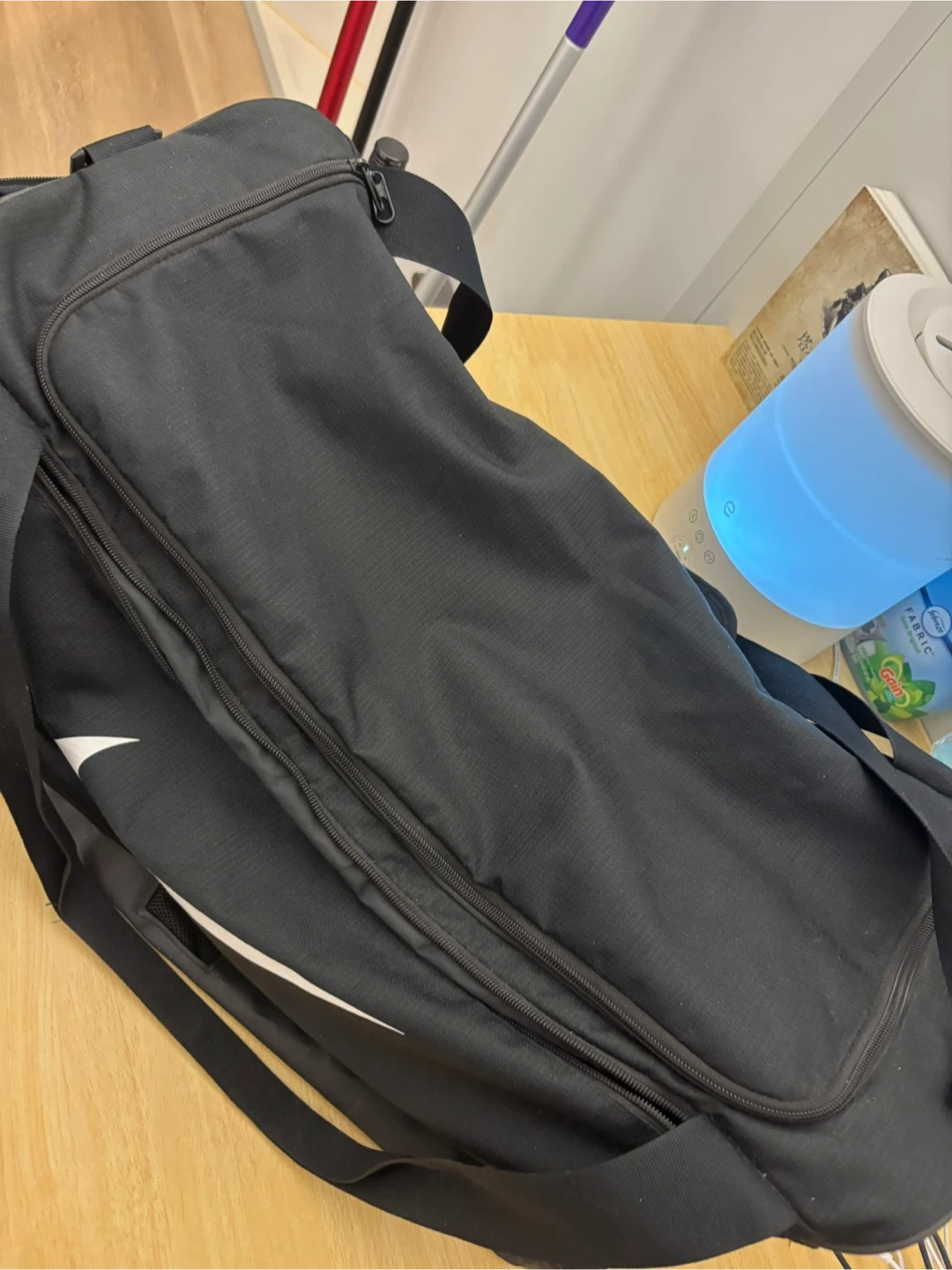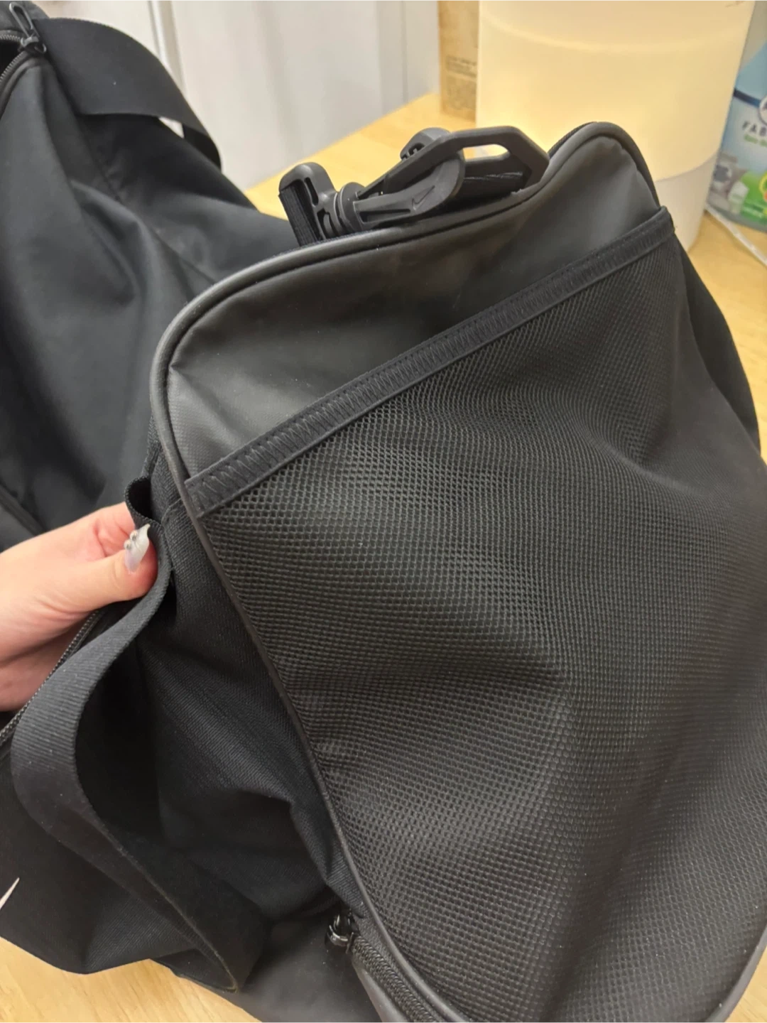 This is a black Nike duffel bag. It has a large main compartment and a mesh side pocket. The durable material is perfect for gym sessions or weekend trips!