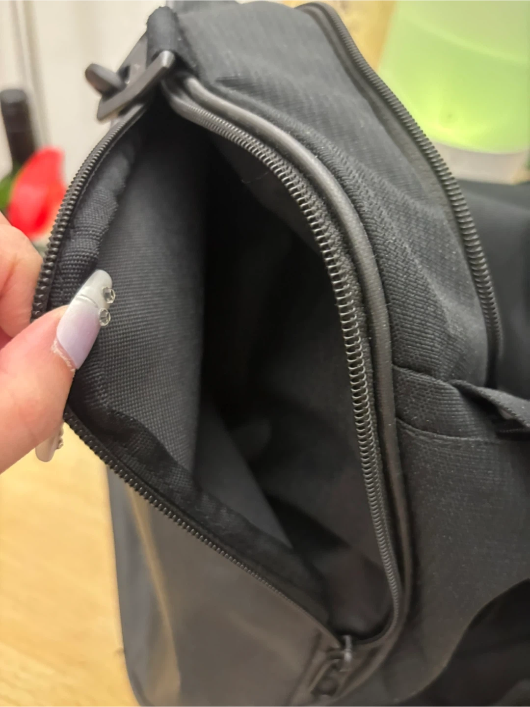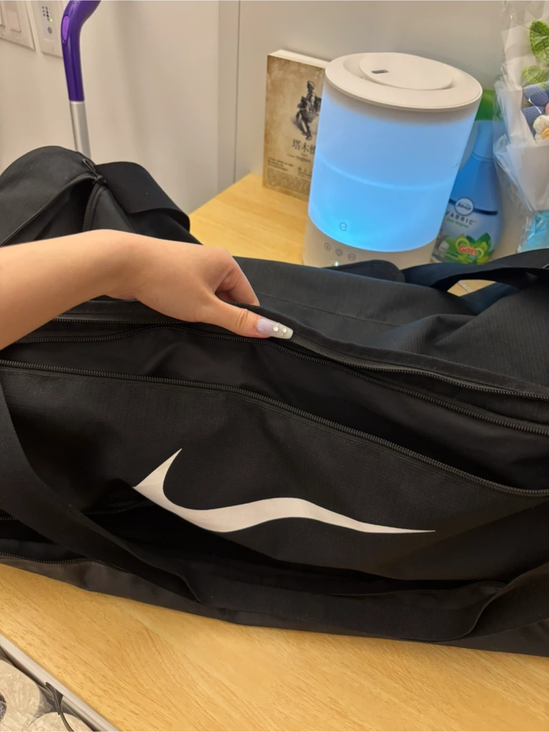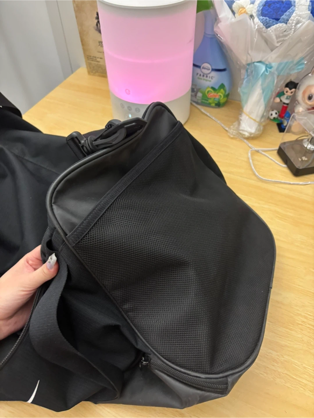 This is a black Nike duffel bag. It has a large main compartment and a mesh side pocket. The durable material is perfect for gym sessions or weekend trips!