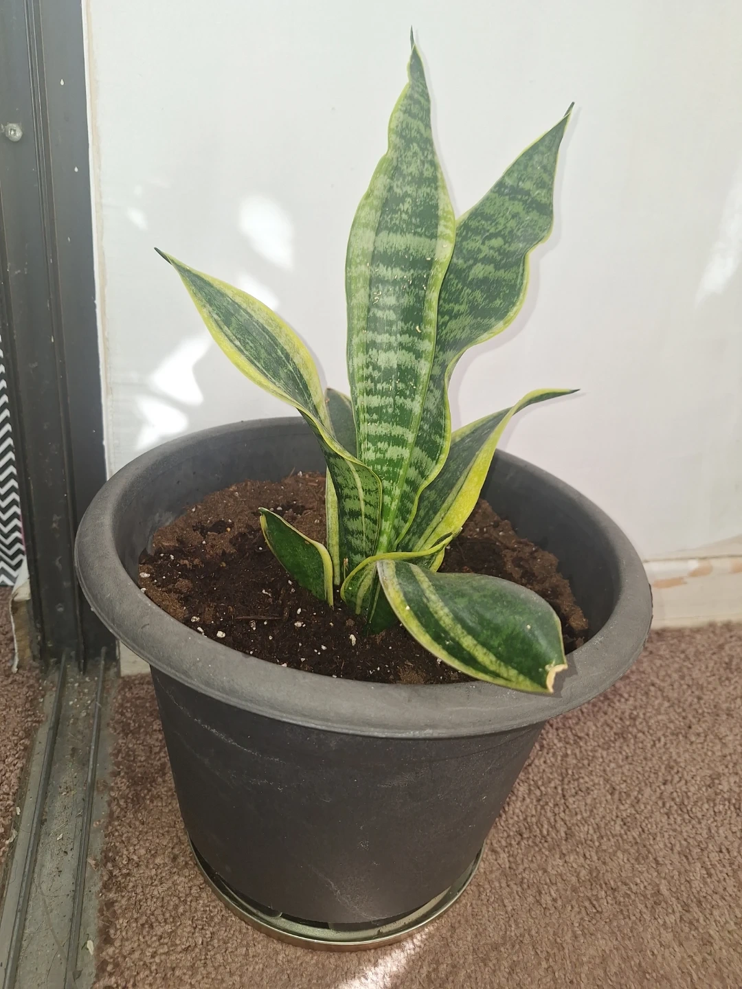 Pick up only. A healthy Sansevieria plant with variegated green and yellow leaves. It's in a grey plastic pot with soil. This plant is known for its air-purifying qualities. New soil changed. Easy to care. 17" tall