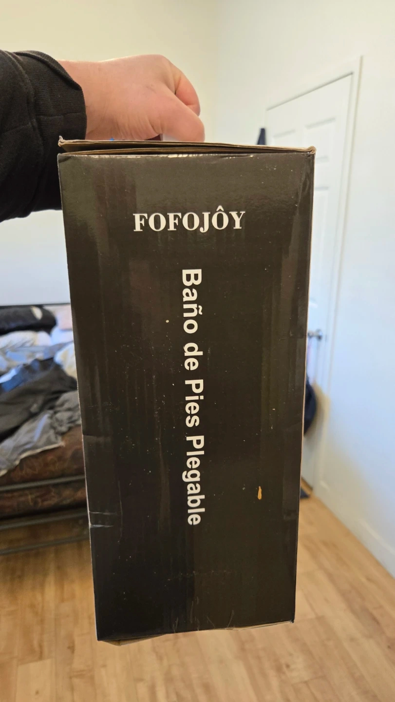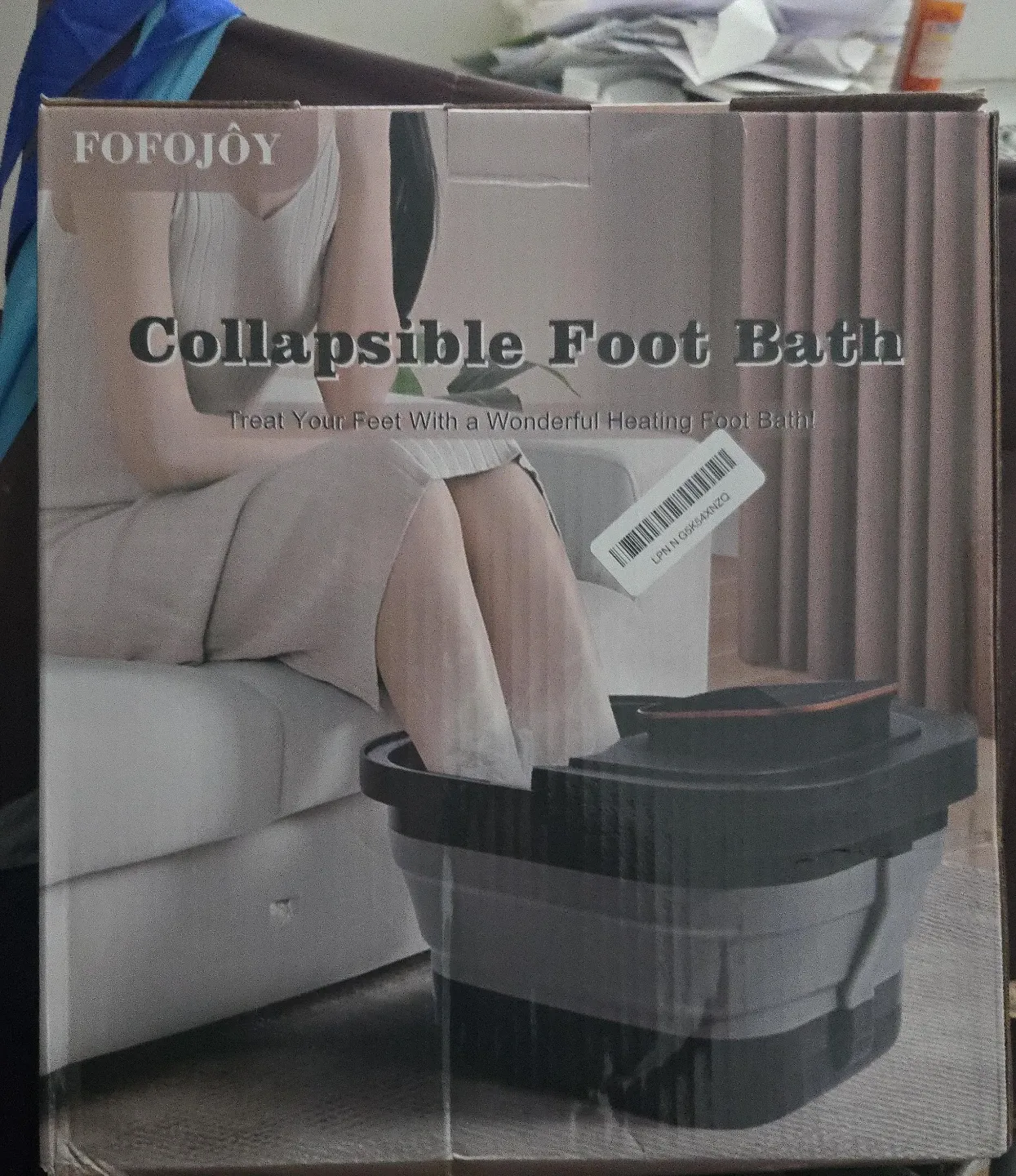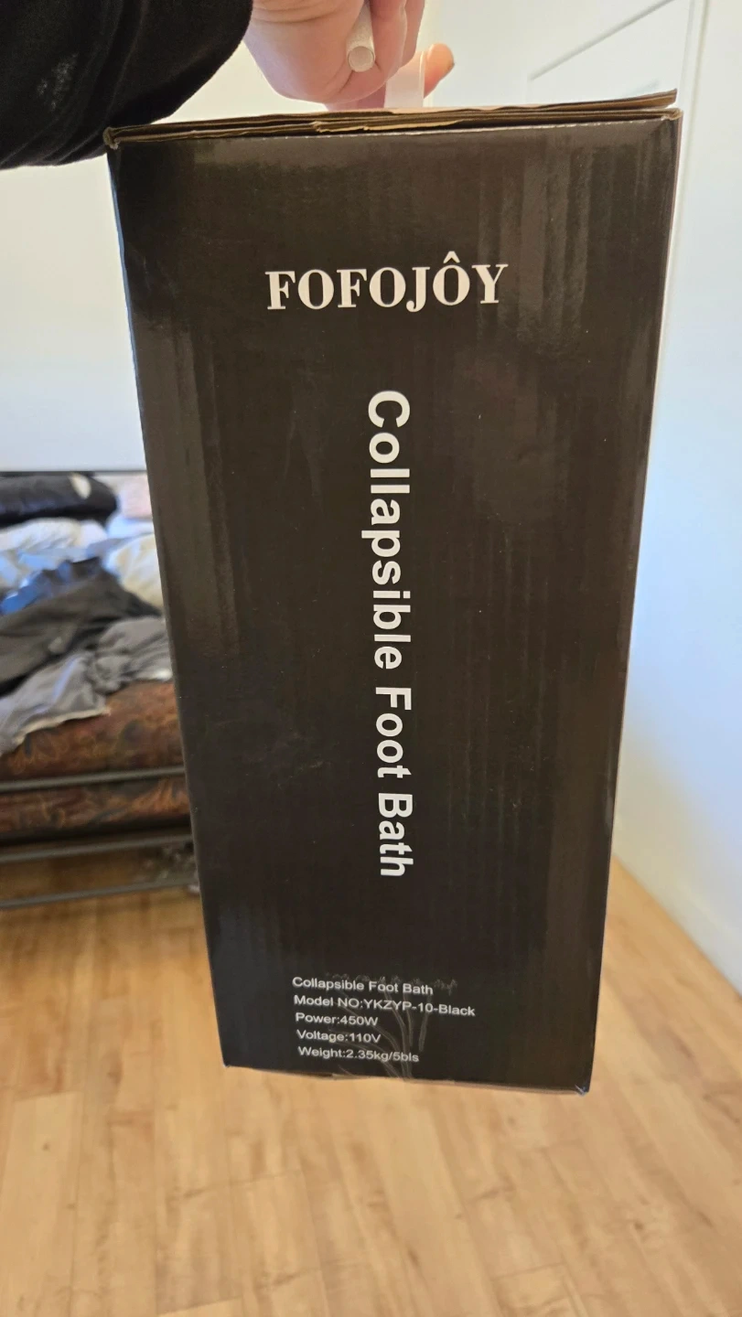 I'm selling a FOFOJÔY Collapsible Foot Bath in black. The box includes the foot bath itself. It is model number YKZYP-10-Black. It has a power of 450W and a voltage of 110V. The weight is 2.35kg/5lbs