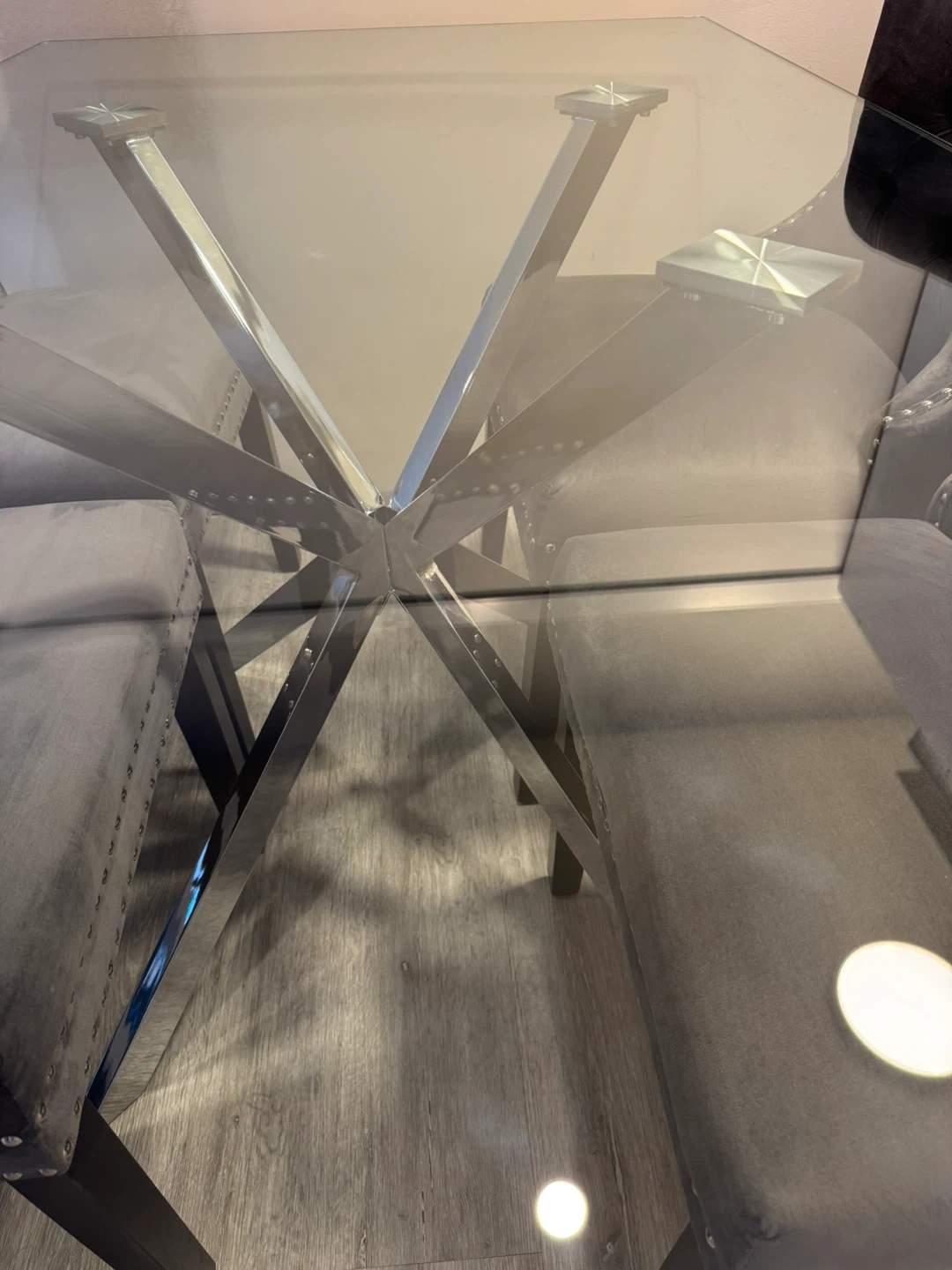 Stylish glass top dining table with a modern chrome base. No scratches no damage, I am selling because I moved to a smaller place. Never used the table as a dining table as we got it only for a decoration for the house to feel modern.