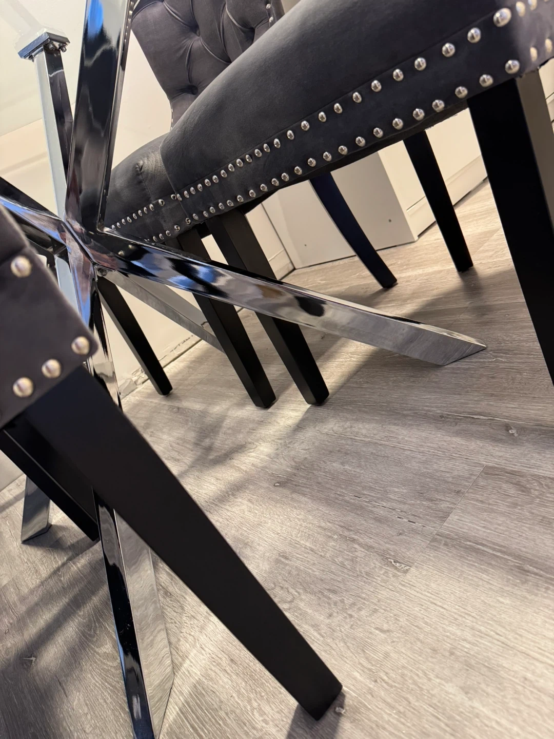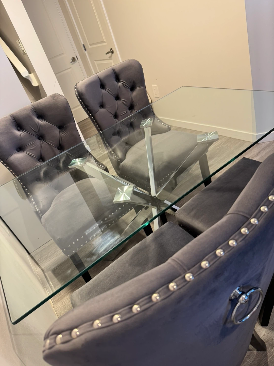 Stylish glass top dining table with a modern chrome base. No scratches no damage, I am selling because I moved to a smaller place. Never used the table as a dining table as we got it only for a decoration for the house to feel modern.