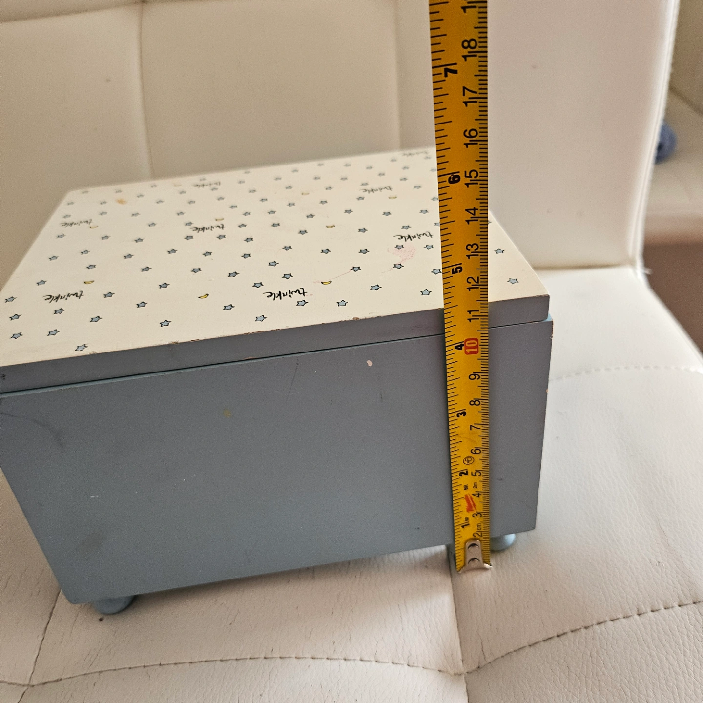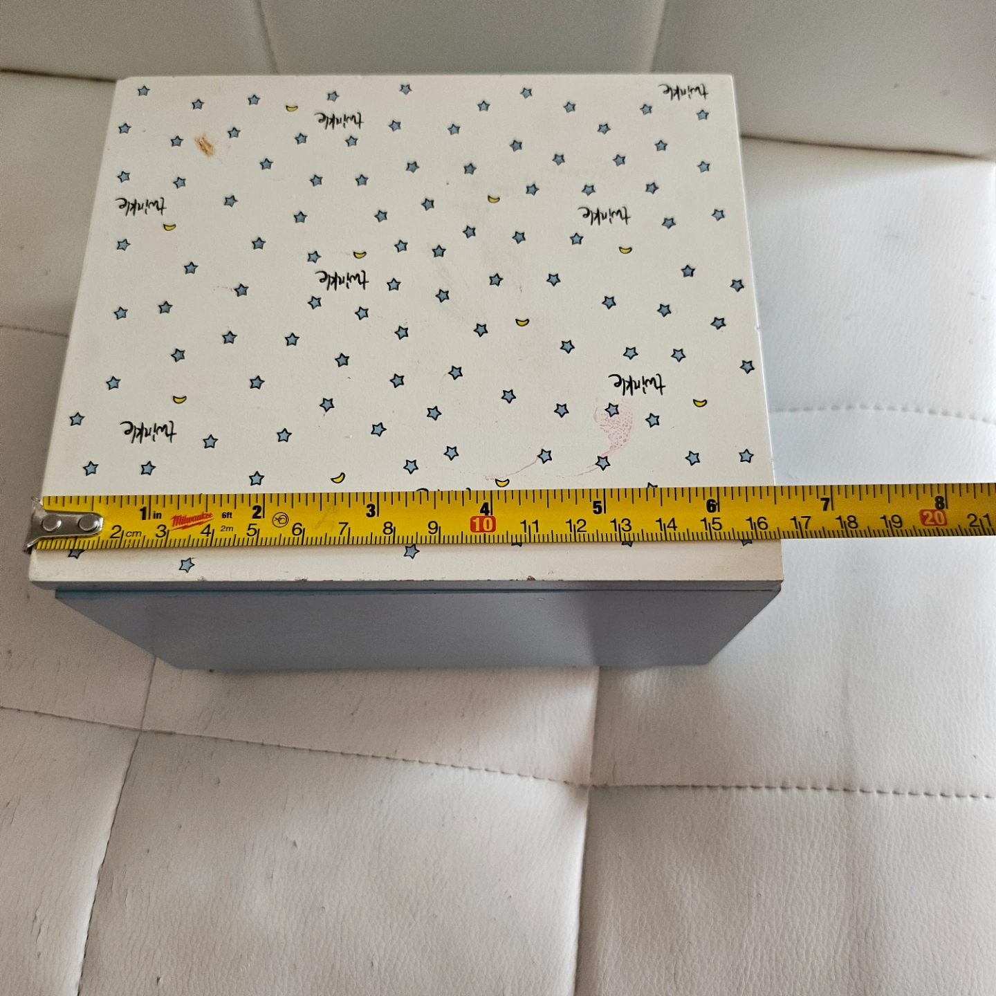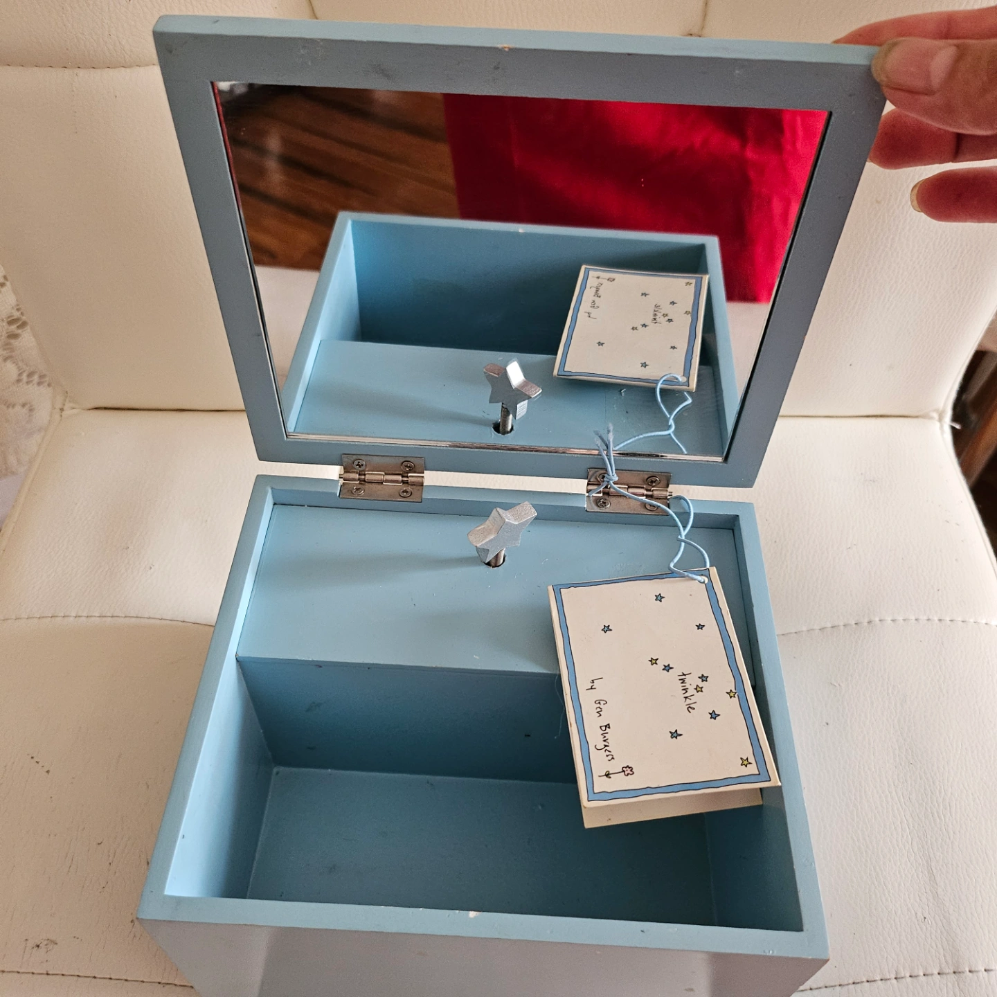 Small, light blue wooden music box. Features a star-shaped winder and a mirrored interior. Top decorated with stars and moons. Plays a tune "twinkle, twinkle little stars "✨️ . it used to be my daughter's collection but she moved out and left this alone.
