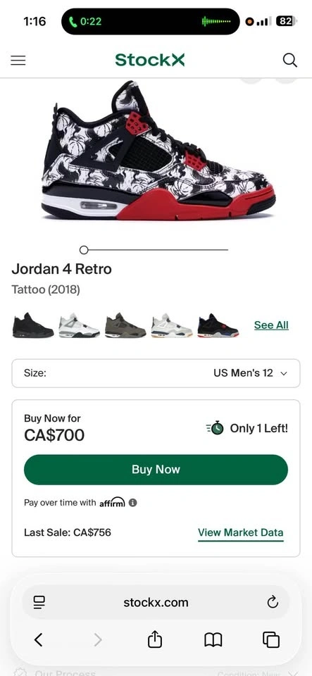 Buy & SellNike Jordan 4 Tattoo Size 12 USNike Jordan 4 Tattoo Size 12 US$600Brand new, dead stock. No box.WHERE TO MEETCheck LocationView MapSELLERverifiedalexpetrieSumas Way600 reviews0 chats·0 favorites·5 viewsSEND CHAT TO SELLERHi alexpetrie! I’m interested in your listing.Hi alexpetrie! I’m interested in your listing.Get the Karrot app to chatSign In to chat