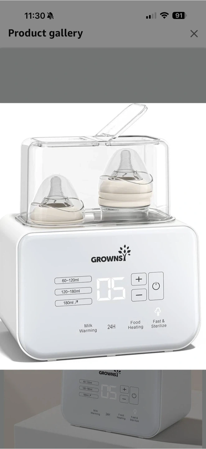This GROWNSY device warms milk and heats food. It also offers a fast sterilization function for baby bottles. It includes settings for 60-120ml and 120-180ml bottles, plus a 180ml option.