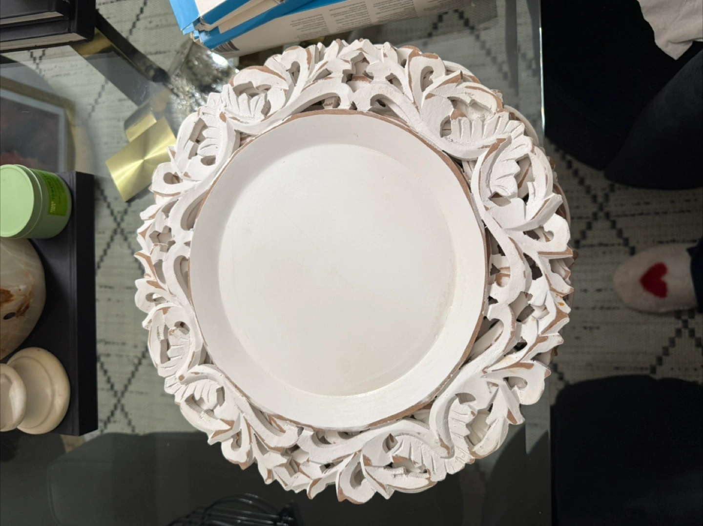 Selling a set of decorative white wooden charger plates. They feature a beautiful carved floral design around the edges. Perfect for adding a touch of elegance to your table setting!