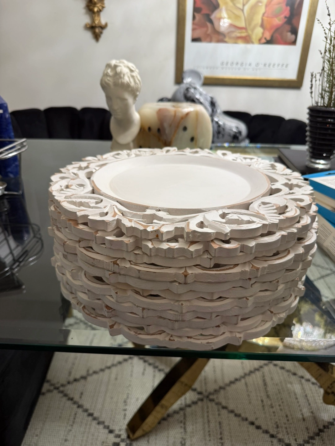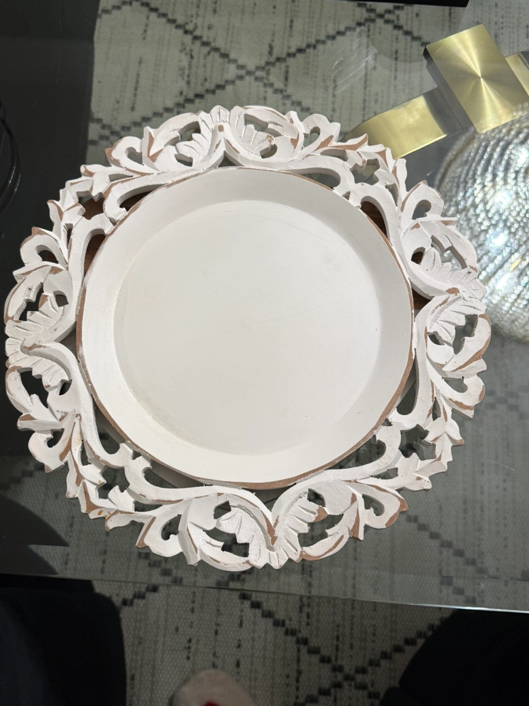 Selling a set of decorative white wooden charger plates. They feature a beautiful carved floral design around the edges. Perfect for adding a touch of elegance to your table setting!