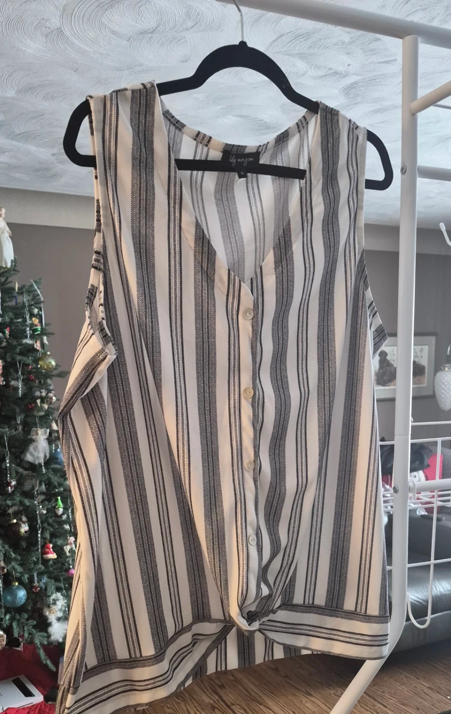 Striped sleeveless top from Lily Morgan. Made of 95% polyester and 5% spandex. Features a button-up front and a knotted hem. Manufactured in Bangladesh.