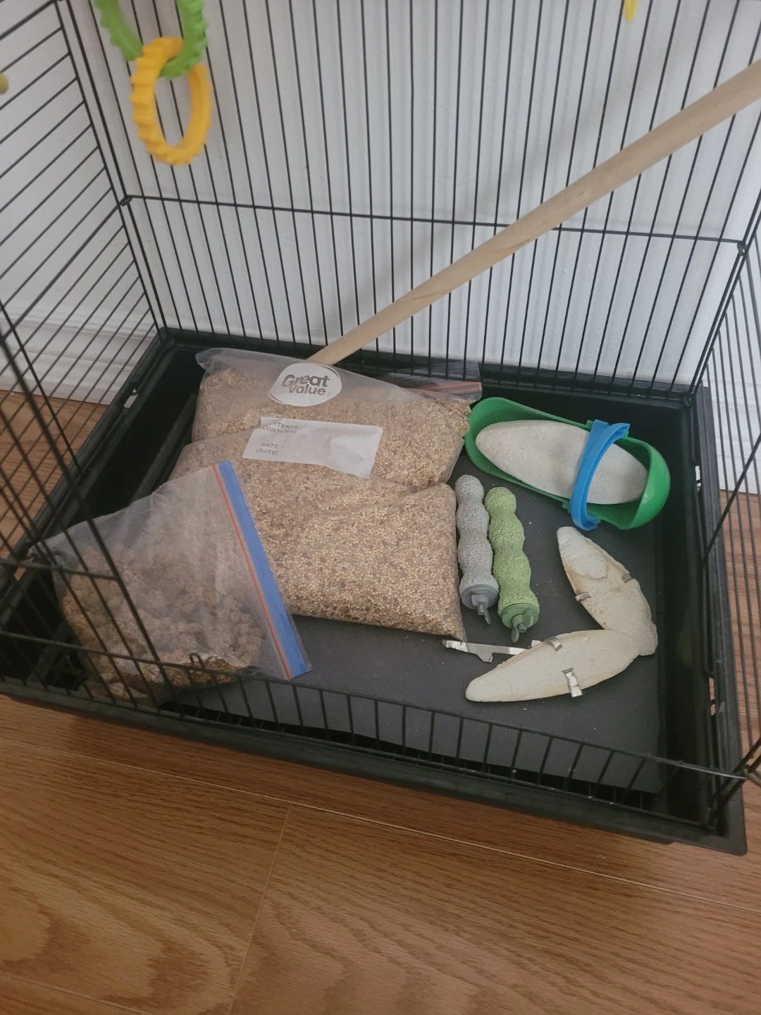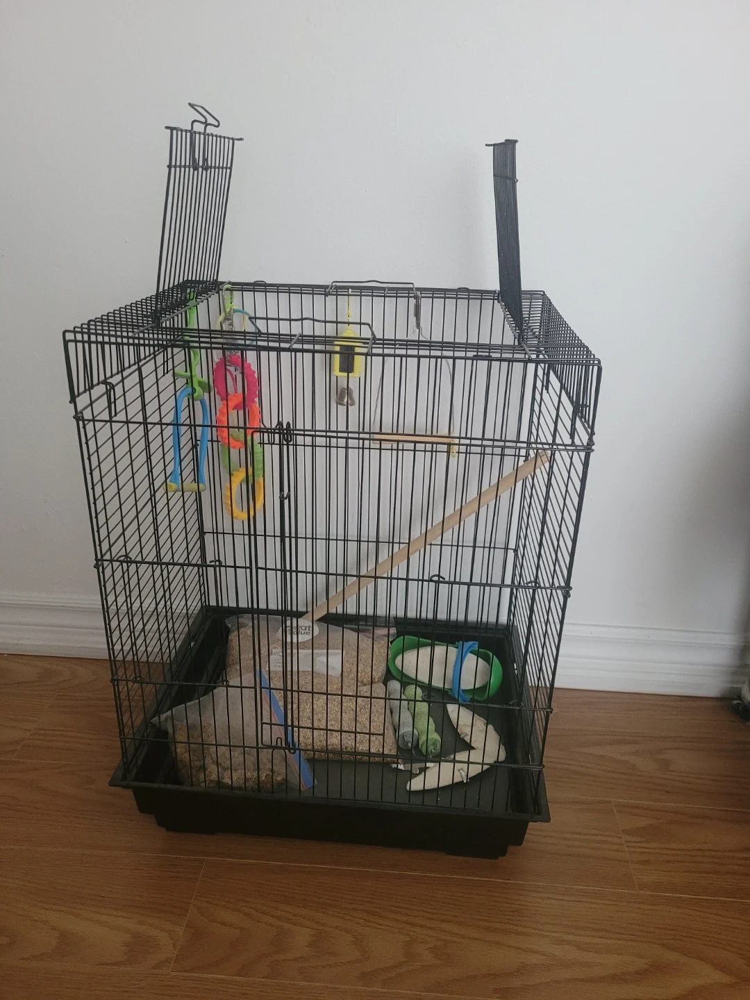 Black metal bird cage with a plastic base. Includes one bag of birdseed, a cuttlebone, a green food dish, and several hanging toys. It's suitable for birds like parakeets or finches. Ready for a new feathered friend!