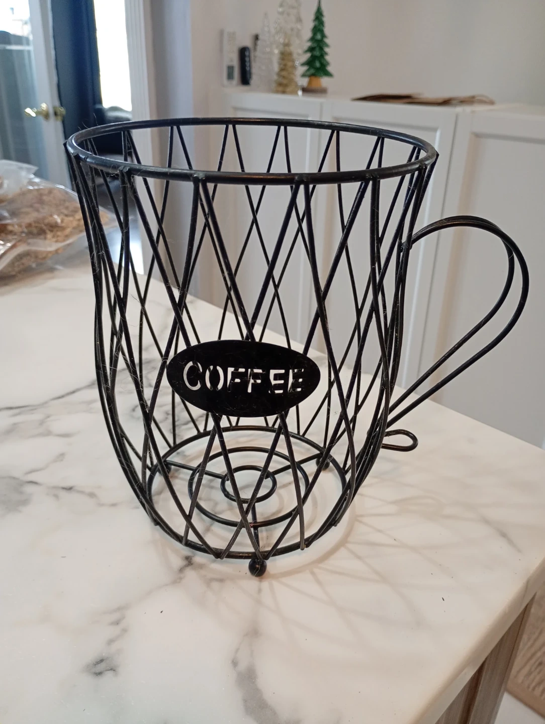 Ce porte-capsules en fil métallique noir est conçu pour ranger vos capsules de café. Sa forme de tasse unique ajoute une touche décorative à votre comptoir. Parfait pour organiser votre station café. Mesure environ 20 cm de haut.