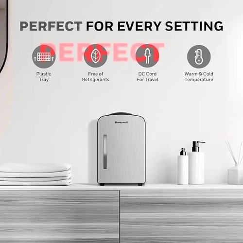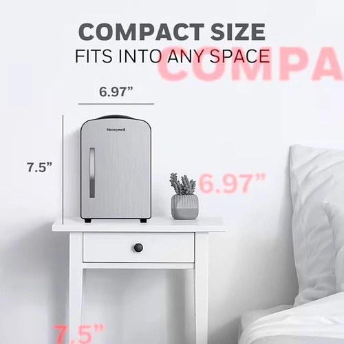 Honeywell 4 Liter Personal Fridge. Cools or heats and provides compact storage for skincare, snacks, or 6 12oz cans.