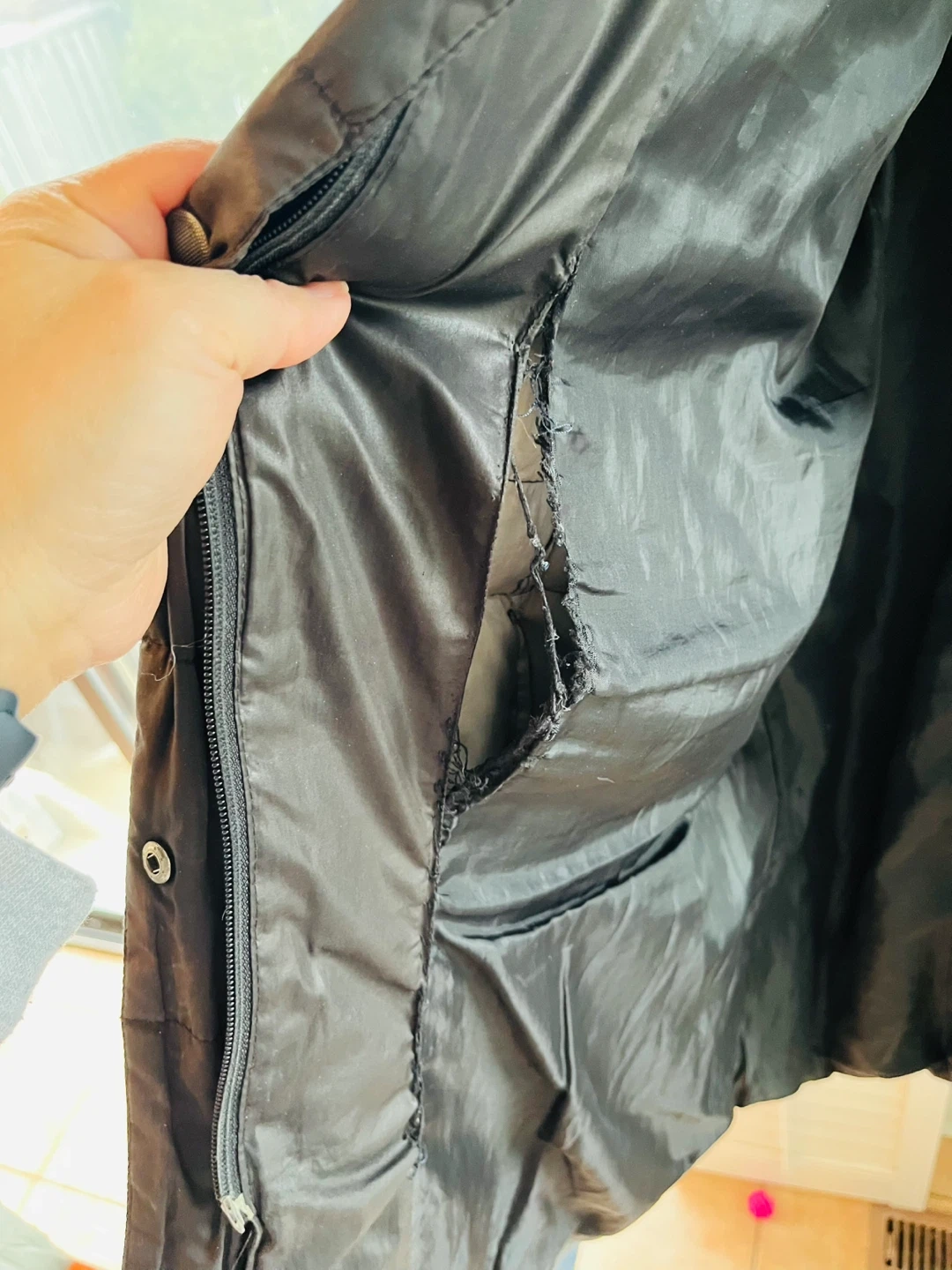Good condition with a tear inside lining that can easily be fixed (see picture). XL size. Light puffer jacket with removable hood. $15 CAD firm. Smoke Free Home.