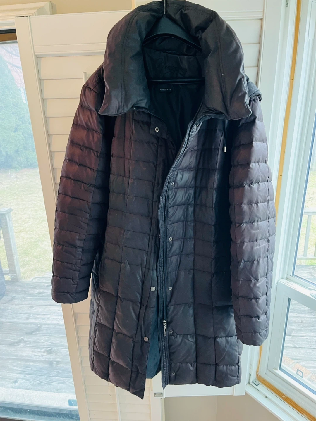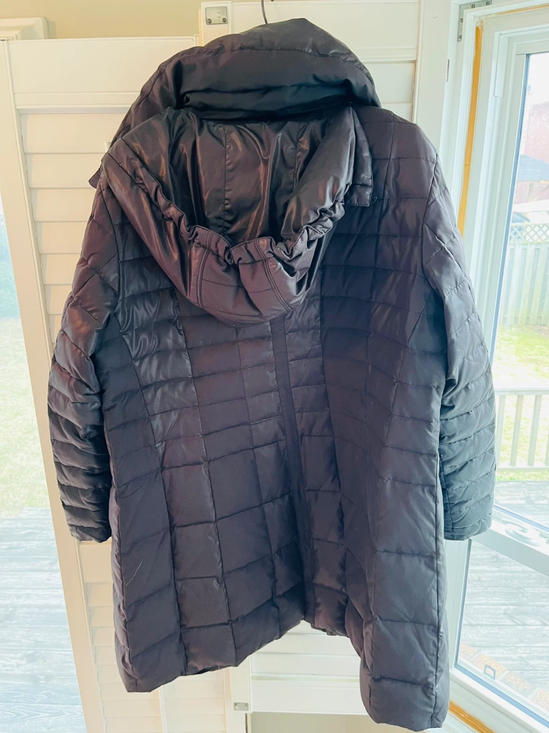 Good condition with a tear inside lining that can easily be fixed (see picture). XL size. Light puffer jacket with removable hood. $15 CAD firm. Smoke Free Home.