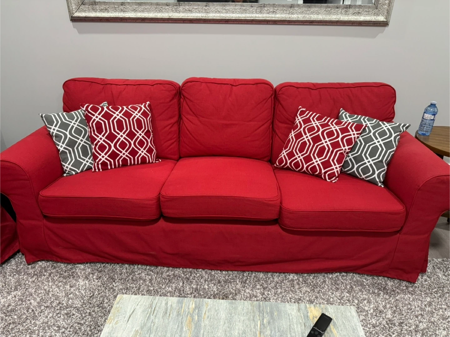 Comfortable red 3 piece sofa set featuring a removable slipcover for easy cleaning. This set offers a 3 seater sofa, 2 seater love seat, and a chair. It also comes with 10 decorative throw pillows in red and light grey. Great for adding a pop of colour to any room! It has not been used a lot. Looks and feels great. Pick up only from Airdrie SW. Coffee table is not included.